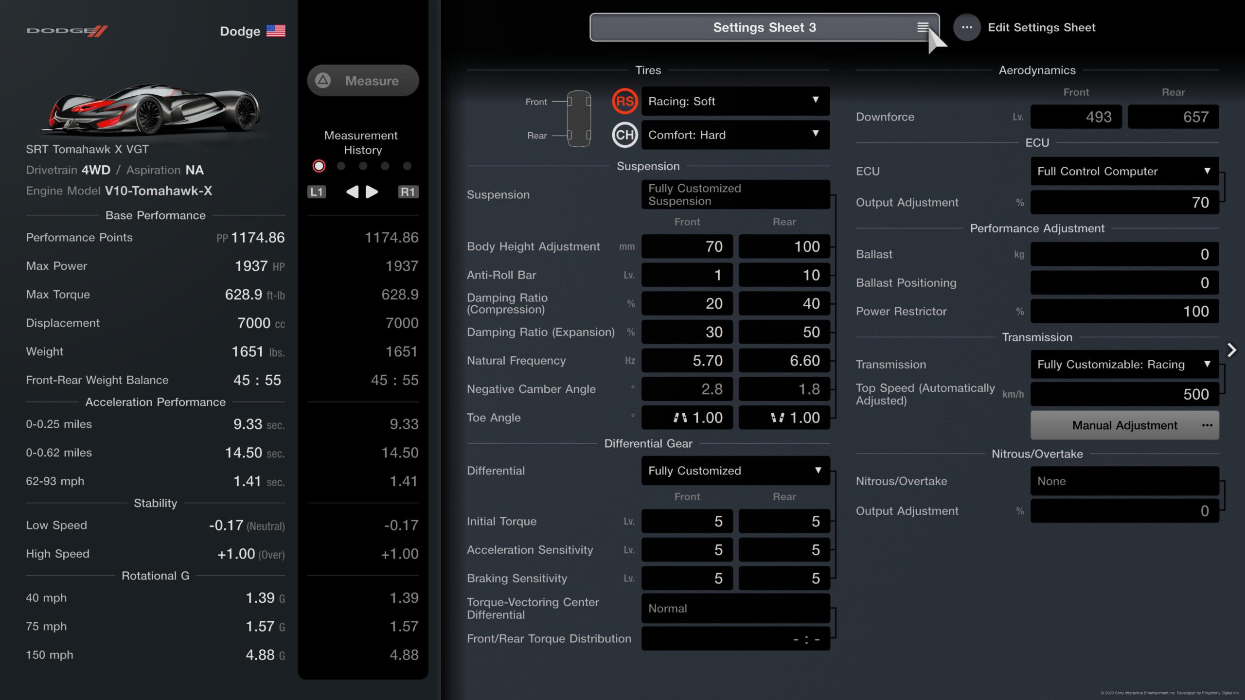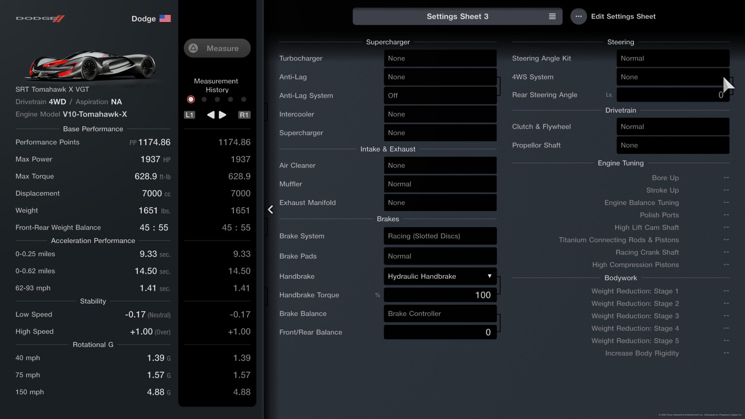 And here’s how it’s recommended to set the Tomahawk up. Note that you will have to spend 1,000,000 credits to buy the Tomahawk X if you don’t already have it, but don’t worry: you’ll make that dough back quickly with this method in less than 20 minutes. Plus, it’s good to keep one of these in your garage for the next exploit that inevitably involves this spaceship on wheels, as many have tended to since GT7 came out.