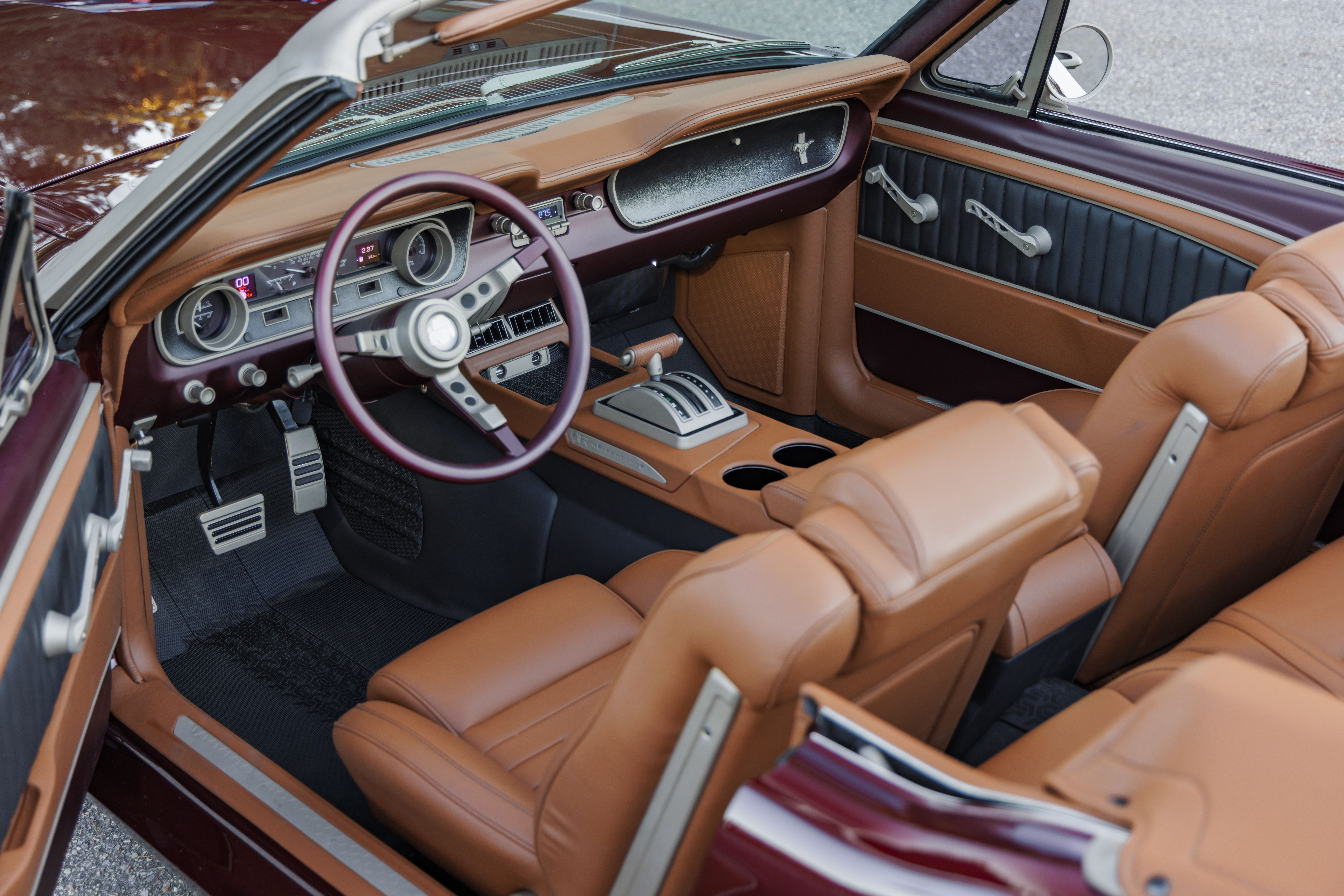 But the typical Ringbrothers touches are there, with the Cerakote finishing on all of the exterior metal pieces and intricate milling work for the door handles and trim pieces, it all comes together to be an incredible, Singer-level design slam dunk. The interior was redone to match the exterior with subtle touches that are true to the original beauty of the Mustang interior, complete with Dakota Digital gauges.