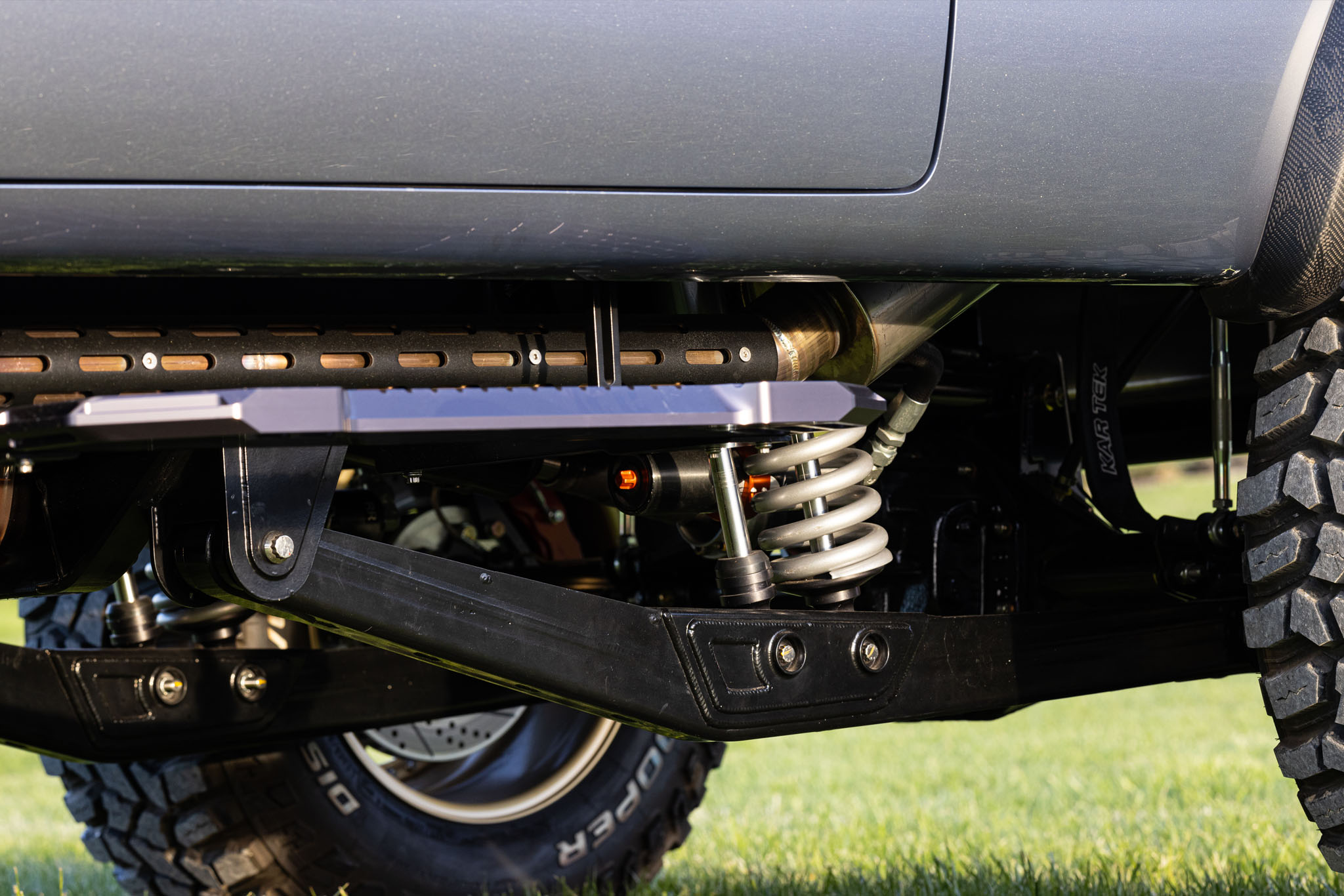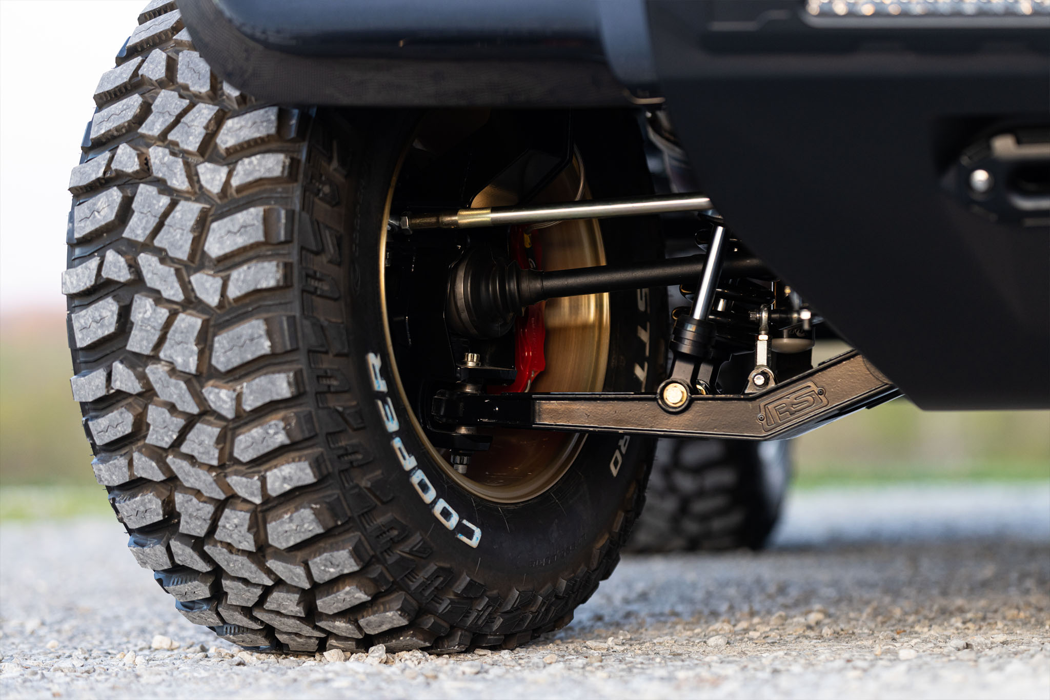 Before we dive into that, though, let me share a few more headline specs. The truck has a Dana 44 front axle and a Dana 60 rear axle. The transmission is a built 4L80E. The shocks are from Fox, there are two per corner, and they help damp the new custom suspension with massive rear trailing arms. The wheels are also custom units from HRE, fitted with 35-inch tires. Stopping this leather-upholstered, custom-painted tank are six-piston Baer calipers at every corner.