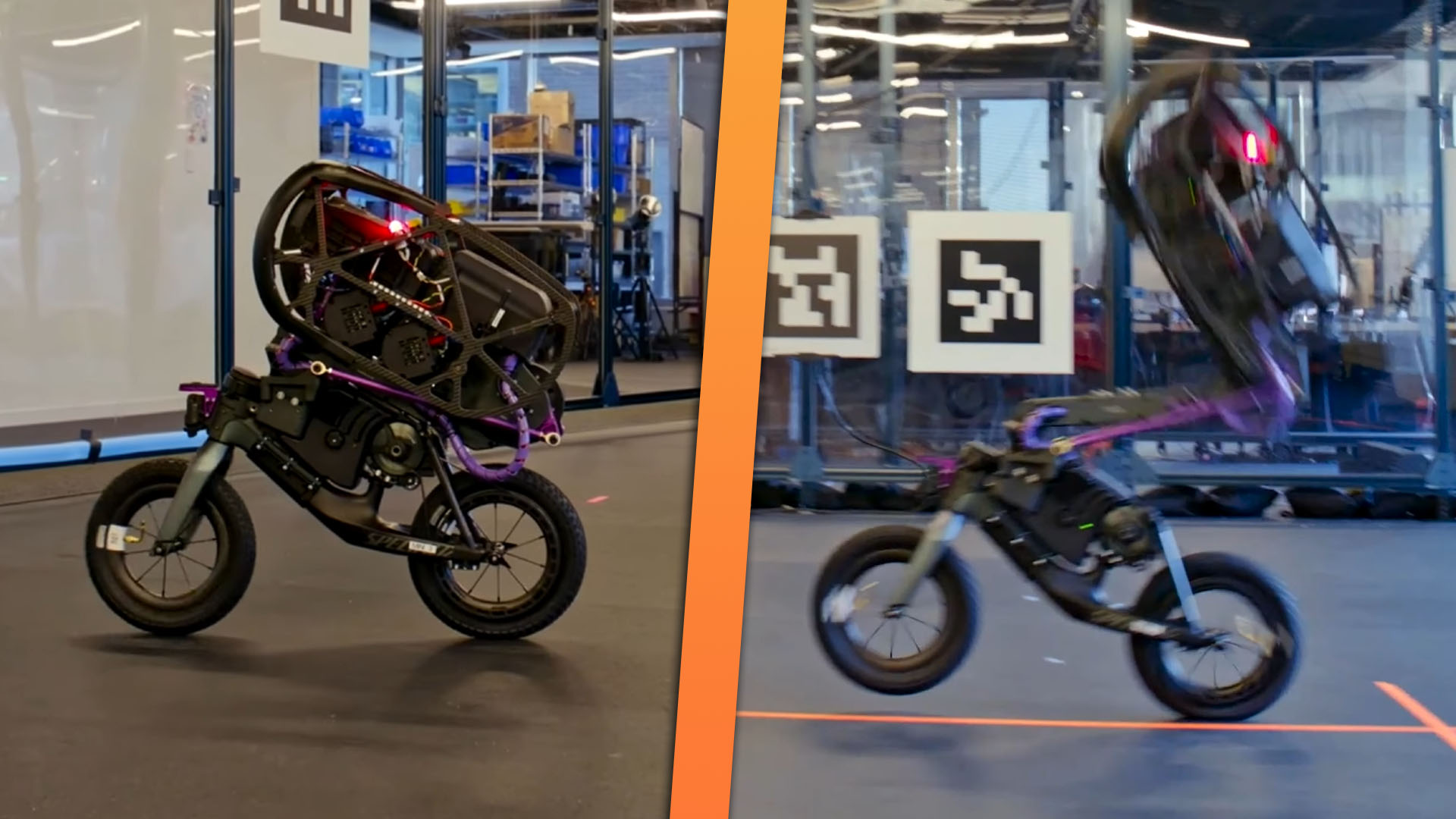 After its bunny hop, the robot even does a track stand, where it comes to a sudden stop and balances itself at a standstill. It’s just showing off at this point. Next, we get a little victory wheelie—cute.