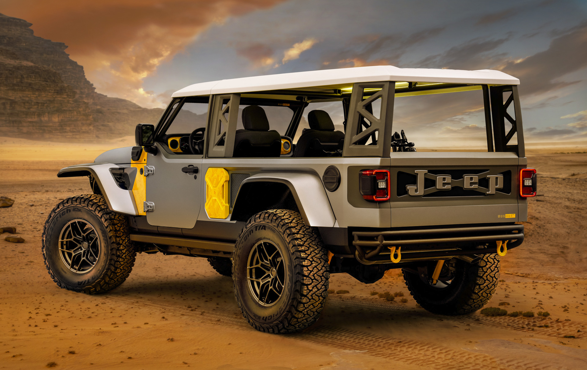 There’s no mention of anything like that in Jeep’s press material, so I don’t think it’s what the company was going for—the Bug Out is just supposed to be an overland rig. It’s simply “lightweighted to reflect what a responsible, modern-day mobile campsite could be,” in Jeep’s words. Like the Honcho it was based on a four-door Wrangler, cut-up and stripped down to become a two-door truck with a big cargo area and a roof spanning the whole body.