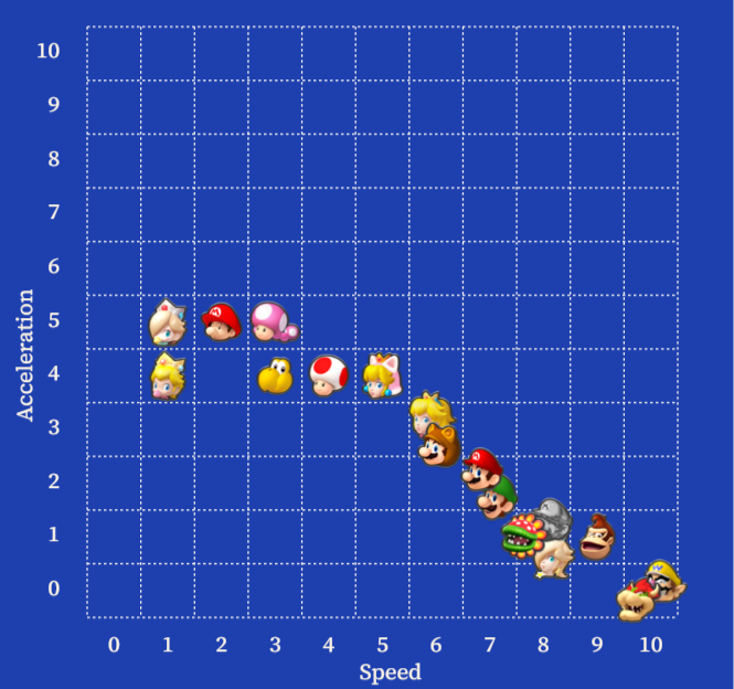That’s where Nintendo comes in. Mario Kart characters come with two variables: speed and acceleration. A simple graph with those two attributes reveals that some characters can be eliminated outright as suboptimal — both their speed and acceleration are equal to or worse than at least one other character. Take out suboptimal options and what’s left is a line of potentially optimized possibilities where any character outperforms at least one of the others on speed or acceleration, but not both. Trade-offs, remember? That line is called a Pareto front.