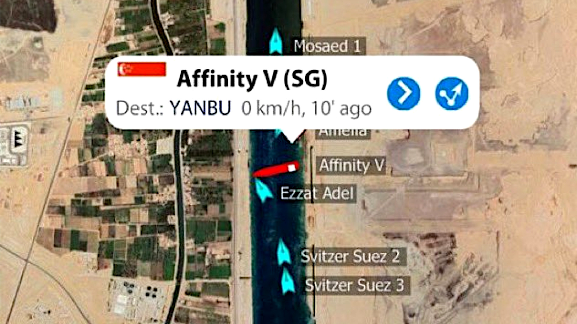 The ship in question is the Affinity V, a large Singapore-flagged oil tanker built in 2016. The 827-foot long vessel ran aground at approximately 7:00 PM on Wednesday night local time. The ship was stuck sideways in the canal in the vicinity of the village of Abu Sial, temporarily blocking the canal to traffic in both directions. The Affinity V was headed for the Saudi Arabian port of Yanbu at the time of the incident.