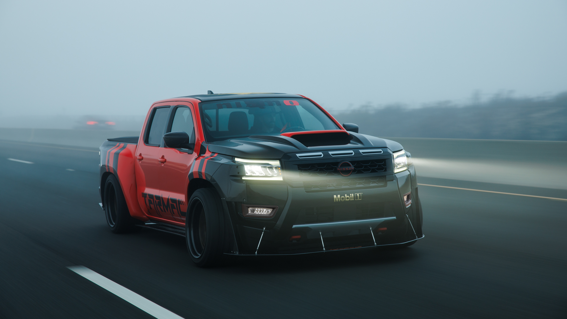 To slam the body-on-frame pickup that low, its rear frame was c-notched and it sits on a custom NISMO coilover suspension kit. That ride height, along with the aggressive new bodywork and massive lower front spoiler make the Frontier TARMAC look like it’s going to scrape… well, the tarmac. And its massively flared wheel arches house 20-inch NISMO wheels wrapped in sticky 315-section Yokohama Advan Sport V017 summer performance tires.