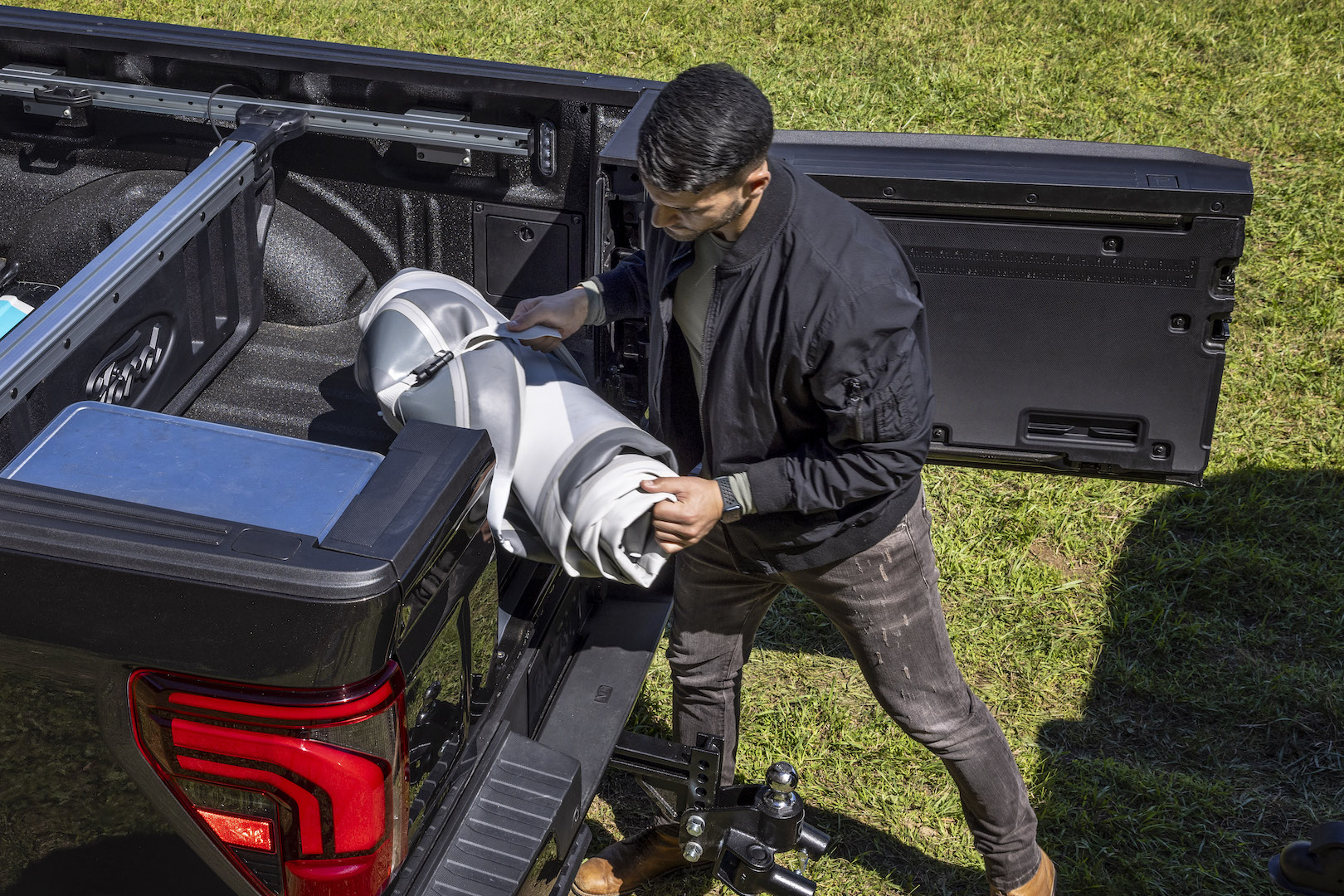 You’ll keep it at 37 if you’re trying not to bonk a trailer jack, or maybe 70 if you’re backed into your garage. One-hundred degrees is the max, for when you want to slide something out but don’t need to swing down the whole tailgate. It’d save you from leaning across the tailgate, giving you 24 inches of extra reach into the bed according to Ford, which a regular tailgate could get in the way of. It also eases access to functions like Pro Power Onboard and the bed storage box, and has been designed to work with bed accessories like dividers and a tonneau cover.