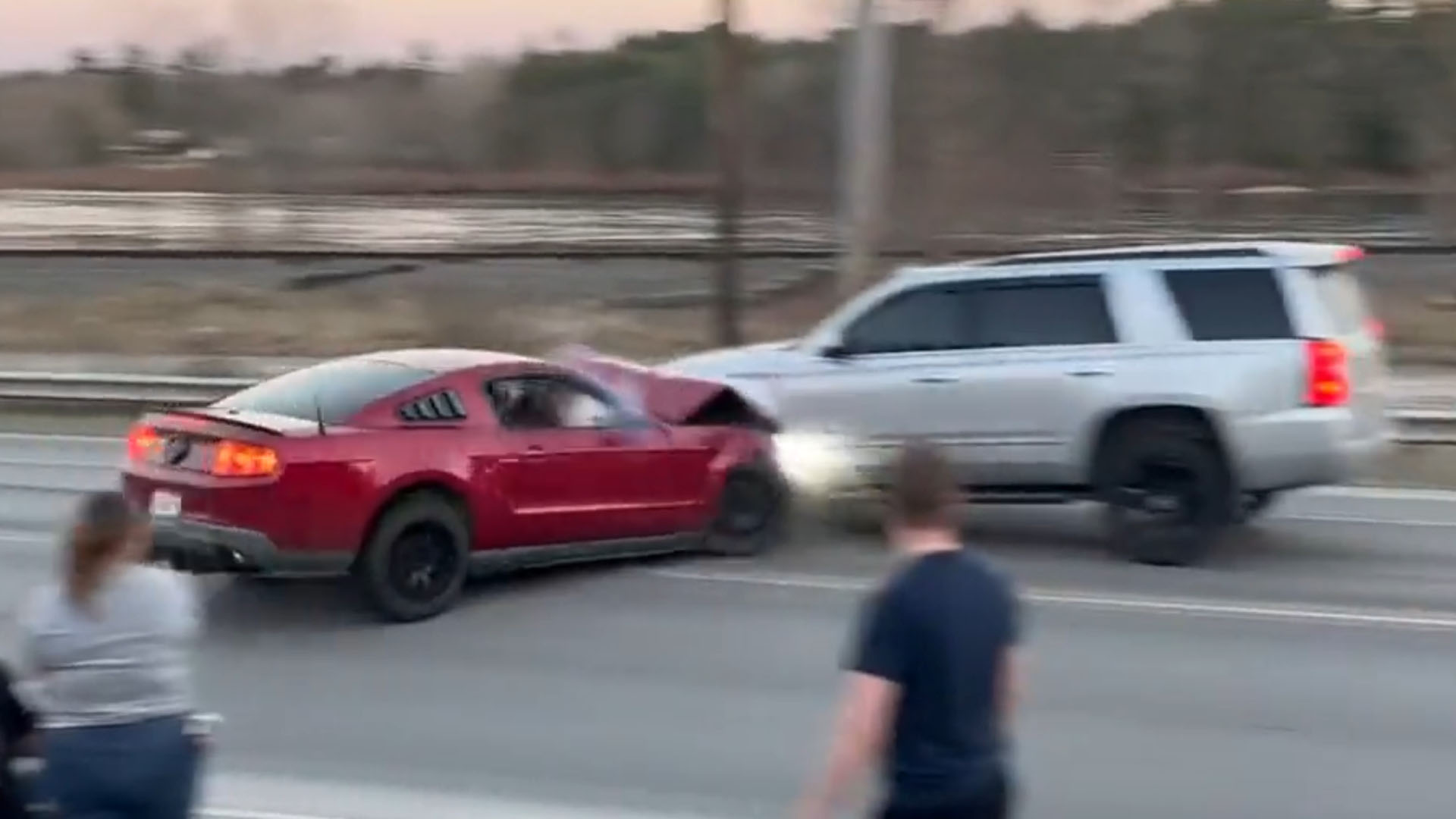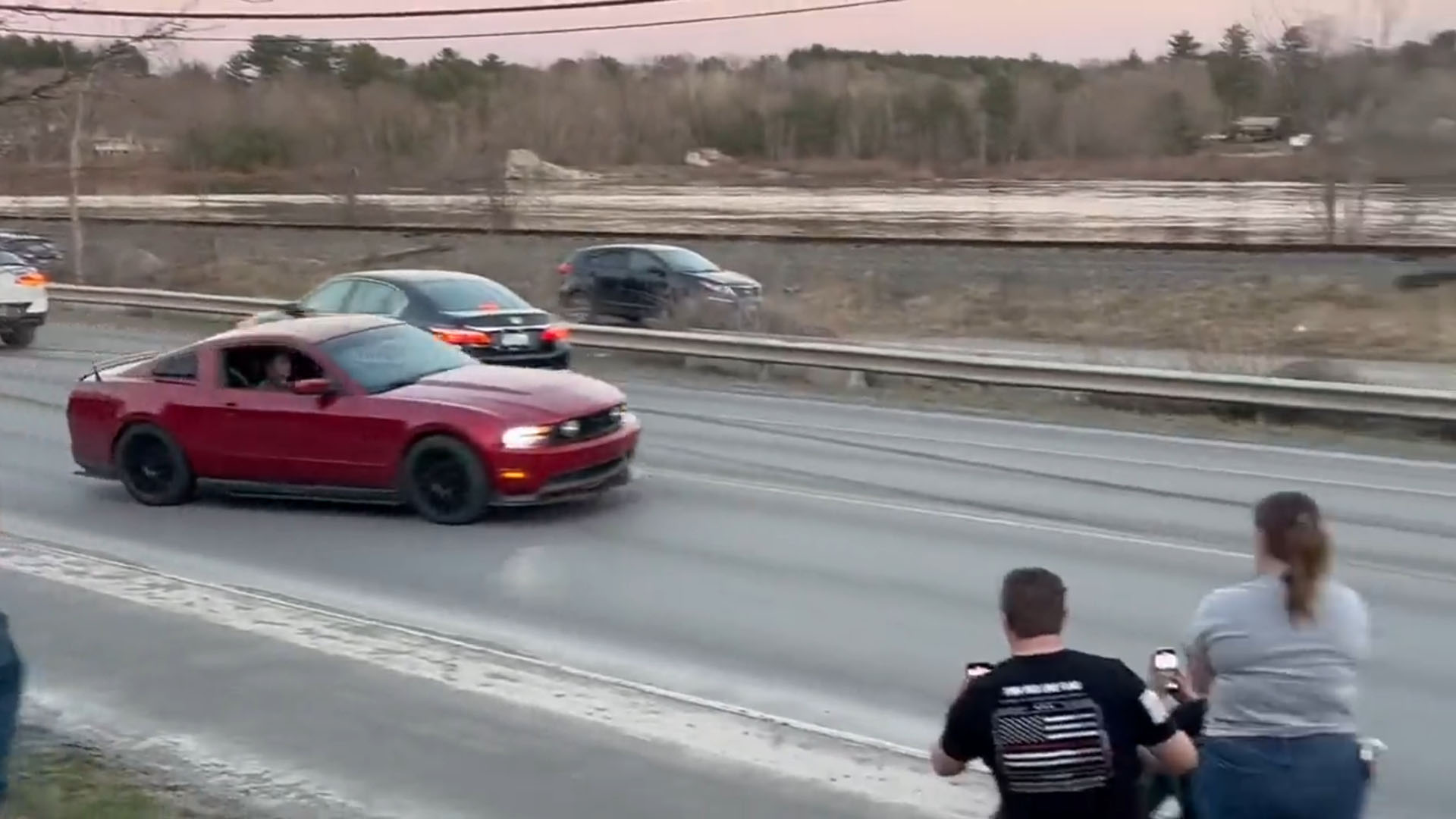 The crash happened in Maine according to the original poster of the video. The car pulls out of the lot where the meet was held, quickly loses control in direct proportion to the throttle applied, and runs straight into the passing SUV. A random person’s day was ruined for no reason—and their reaction, rolling down the window and shouting “ARE YOU SERIOUS,” is both funny and very relatable. For anyone wondering what happened to the driver, he allegedly left in a police car, and the Mustang is reportedly his dad’s. That was probably a rough phone call.