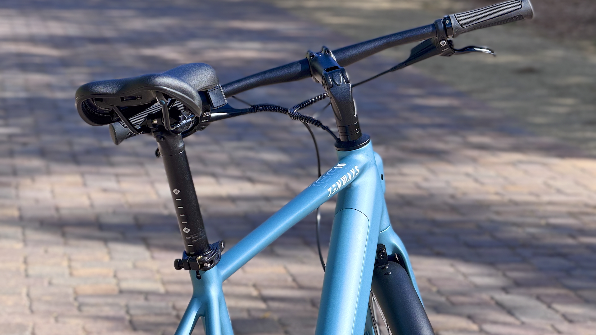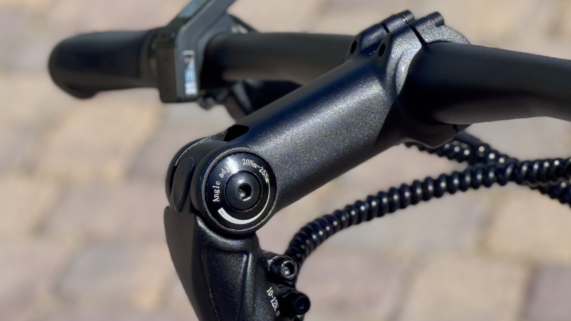 The CGO600 Pro uses 6061 aluminum for both the frame and fork. Tenways sent me a size Large since I’m 6 foot 3 inches tall. The standover height of the top tube is 32.4-inches. For comparison, my Large BMC URS gravel bike is almost an inch shorter. The Tenways’ wheelbase is also an inch longer. If I were doing this again, I’d likely ask for a Medium, so keep that in mind when ordering. The stem is adjustable and pivots where it attaches to the steer tube.