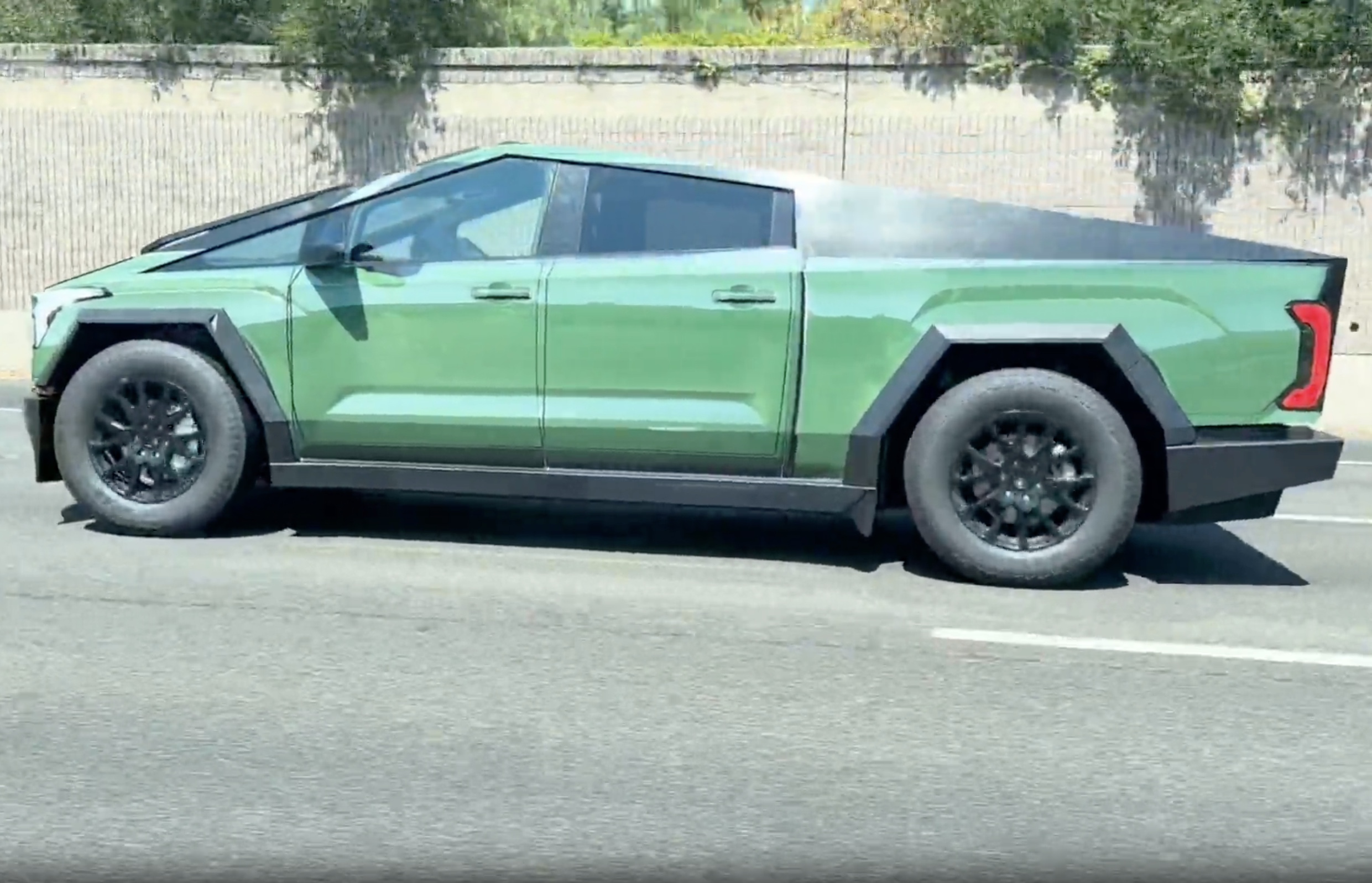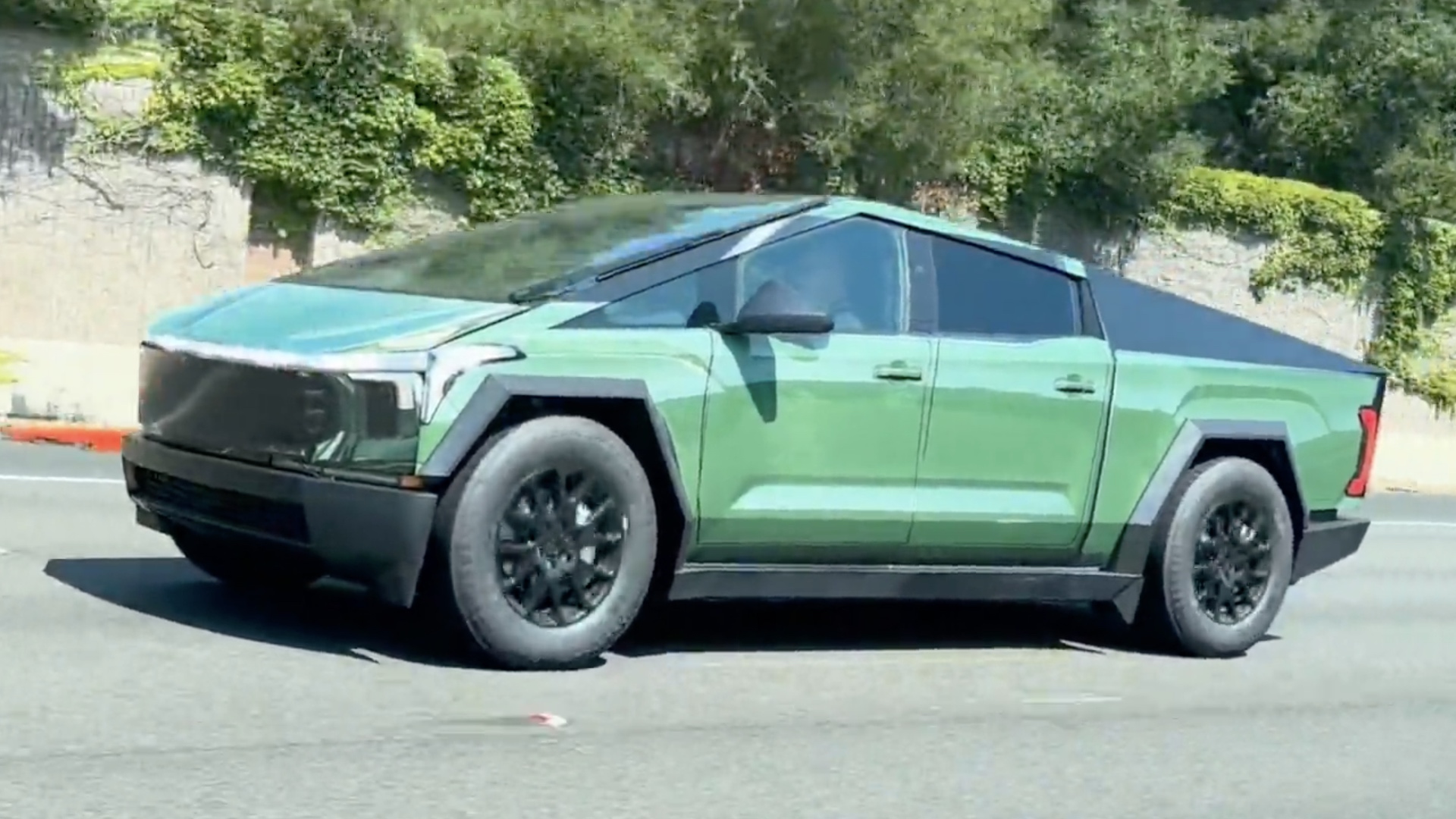 In a video posted to Cybertruck Owners Club, a Cybertruck can be seen rolling down the highway in a wrap meant to mimic the 2022-onward Tundra in dark green. It’s executed in the same way the F-150 wrap was, with its fascias stretched over the Tesla’s and its sides rescaled to fit the Cybertruck’s proportions—partially. The trucks’ rooflines clash, seemingly out of trying to make a statement rather than resulting from a lazy wrap job.