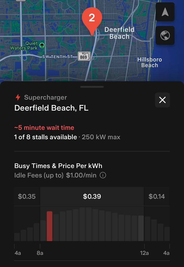 One Supercharger in Florida, for example, is 64% cheaper to charge during the hours that affect Tesla’s Insurance product the most:
