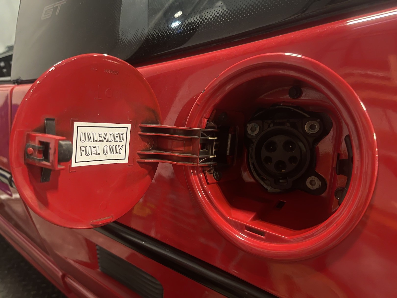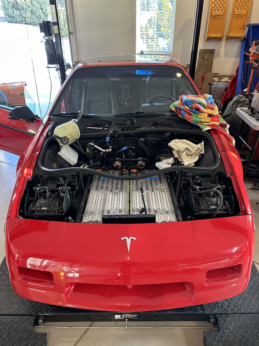 The car’s owner, Tim Bradley, explained that this Fiero was the cream of the crop when he bought it. It was the final-year 1988 GT with the revised suspension, plus the top powertrain, with a 2.8-liter V6 and a five-speed Getrag manual. It had only 14,000 miles when he purchased it, which he did because it was the exact spec of car he met his wife in. Bradley enjoyed the Fiero as-is for a few years, until one evening when he was having dinner with his nephew Nick, who works at Classic EV Conversions. You can see where this is heading.