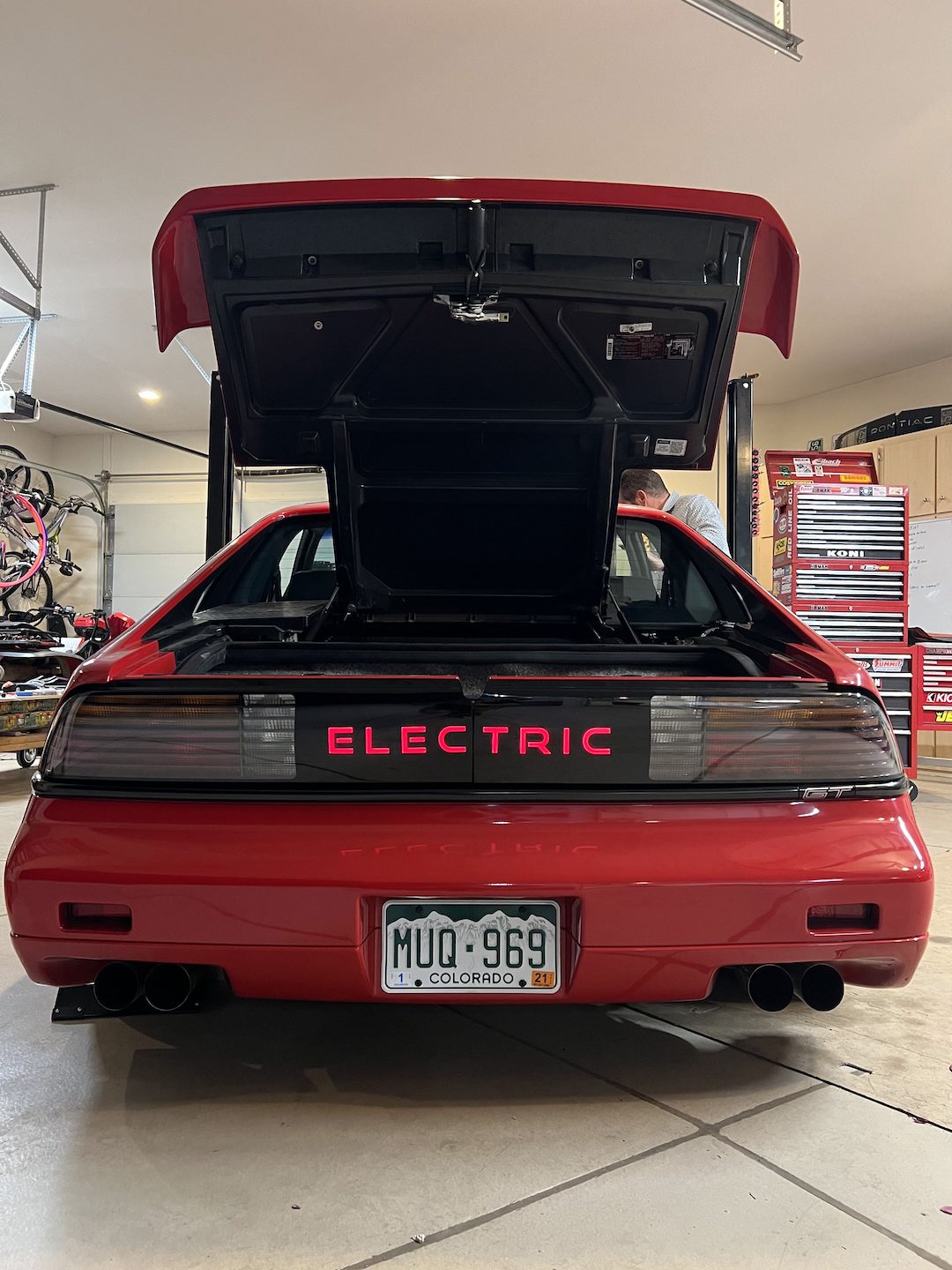 Making the electric Fiero usable has also required rethinking the interior, turning the tachometer into an ammeter and relocating the shifter to a knob on the dash. There’s now a middle cupholder in its place. It still looks mostly original though, minus the taillight that reads “electric” instead of Pontiac. And it makes people wild.
