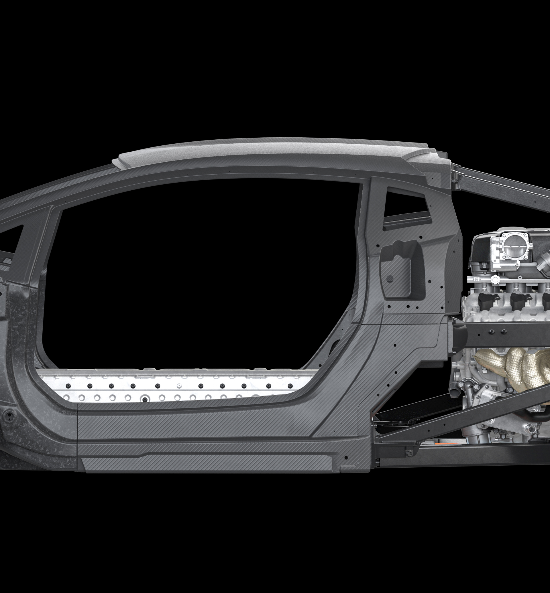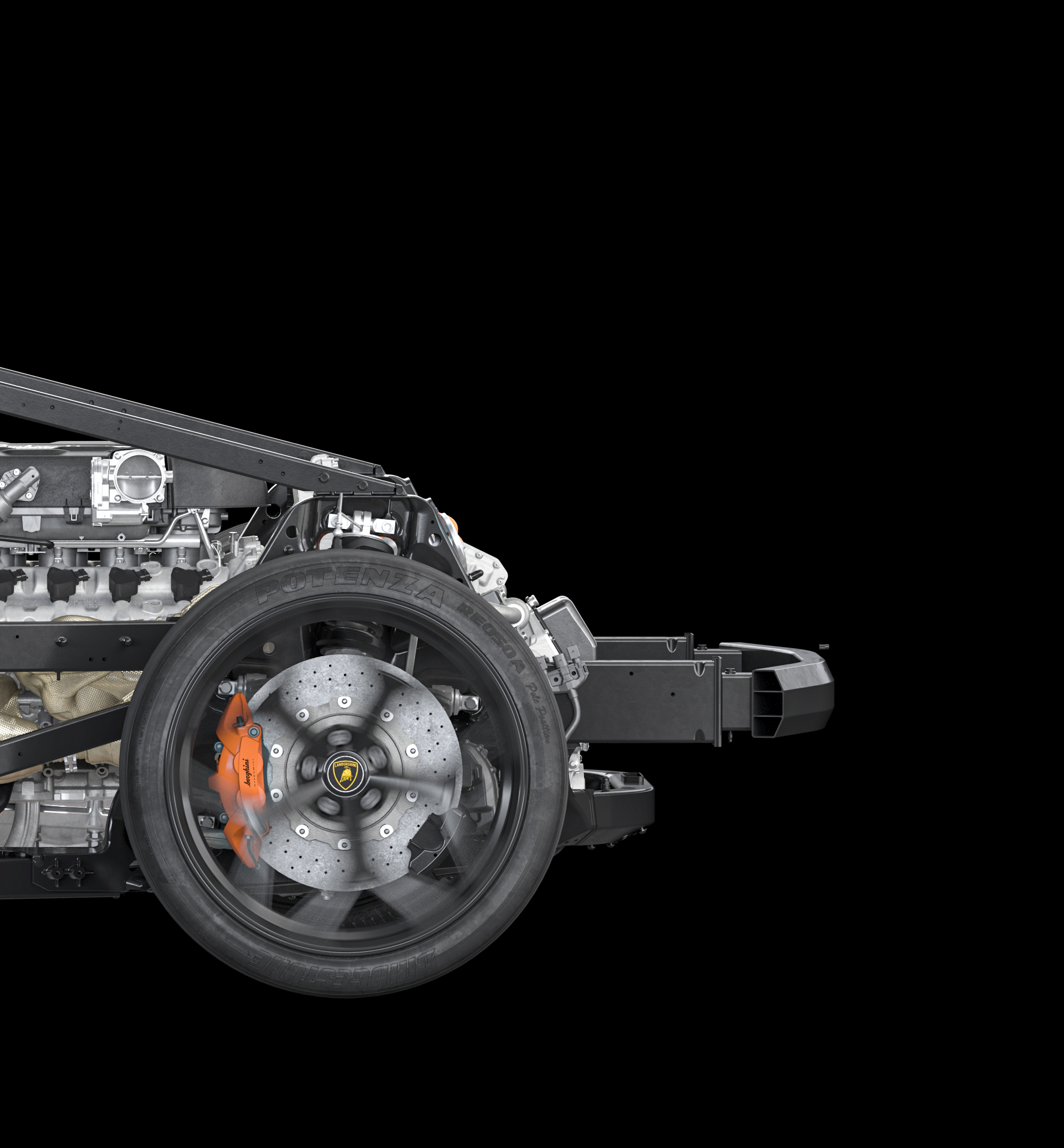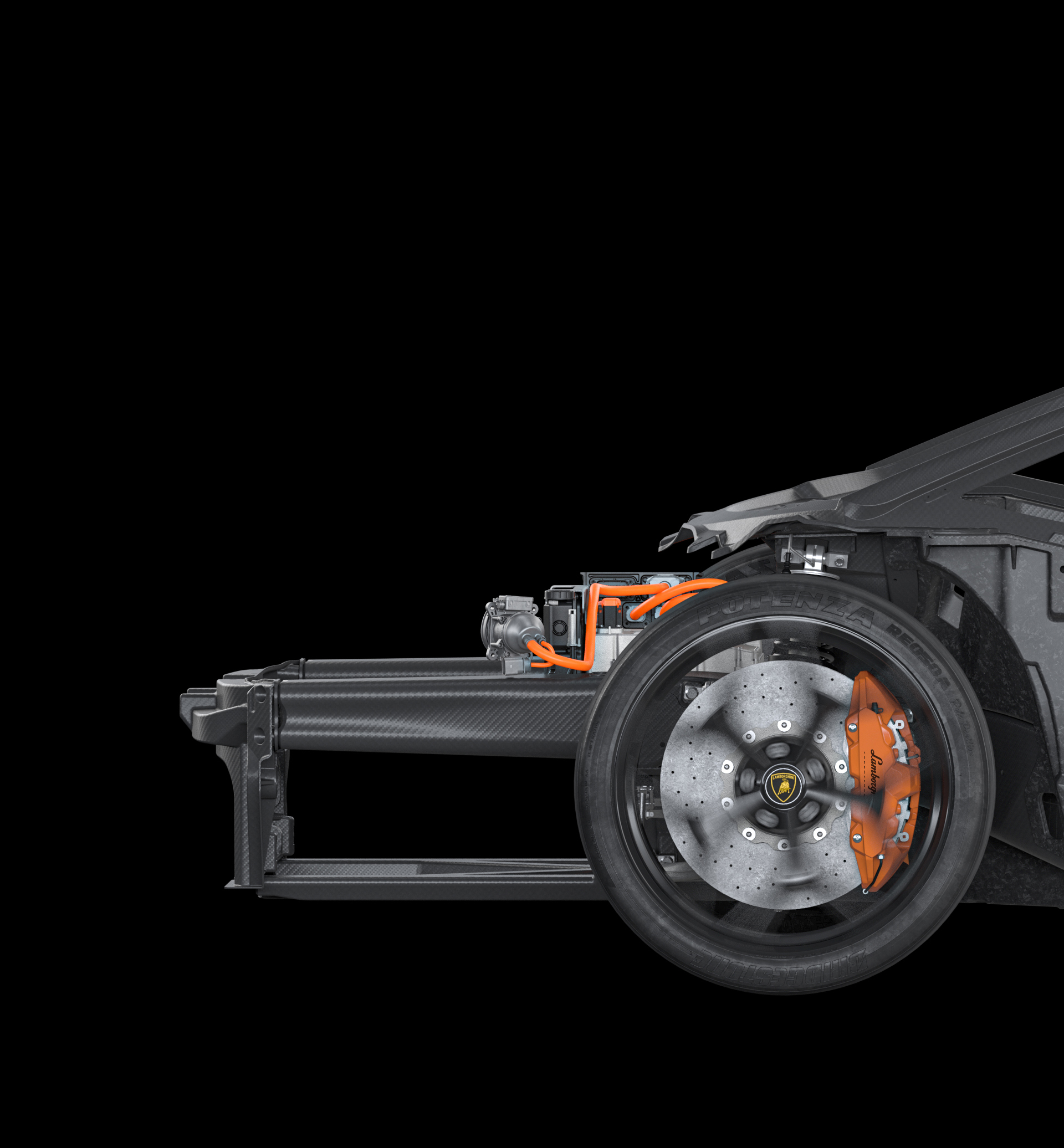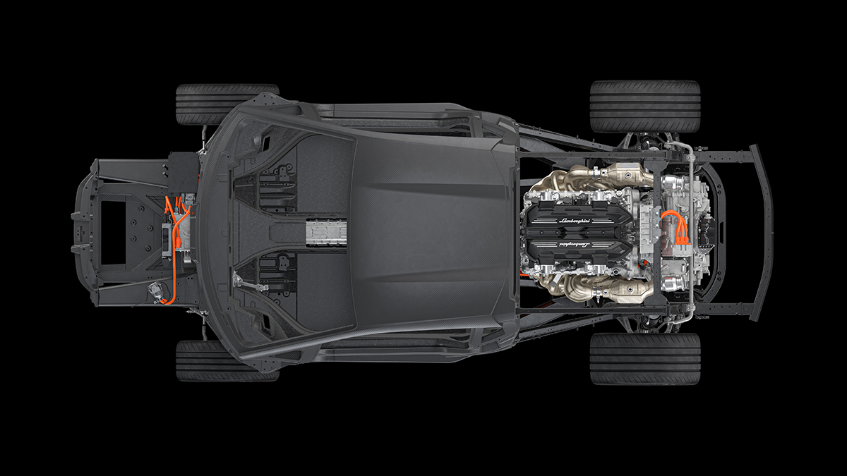 All of the core components that make up the car’s front chassis and monofuselage are born from carbon fiber. That means the tub, firewall, and even the A-pillar are exclusively carbon, and all held together by a unique monolithic mounting method that Lamborghini has named a “rocker ring.”