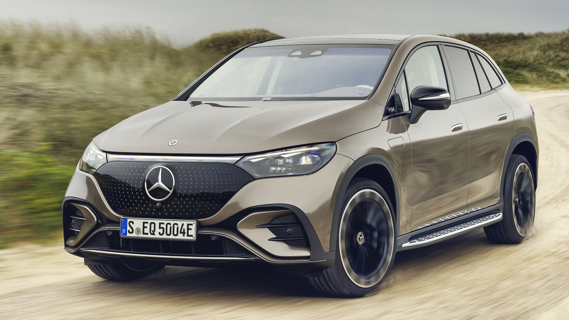 Burmester 3D audio with powerful, cinema-like Dolby Atmos tech comes as standard, and is controllable through a 12.8-inch central OLED touchscreen. It can be optioned up to the monstrous, dashboard-spanning “Hyperscreen,” though its implementation in other EQ products hasn’t been especially impressive so far. There’s a wireless charging pad for phones, a 12.3-inch standard instrument cluster, and a fingerprint sensor tethered to individual driver profiles. LED headlights with active high beams are standard, too, along with passive safety tech and advanced driving assists, both of which have available extra features.