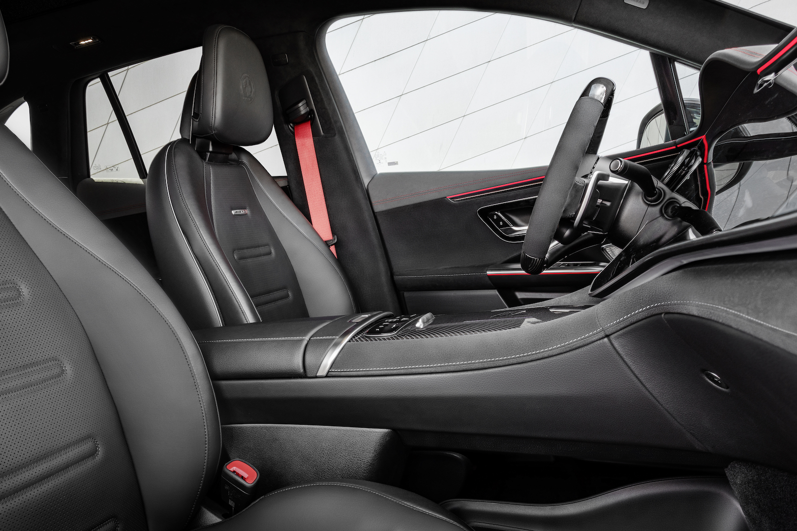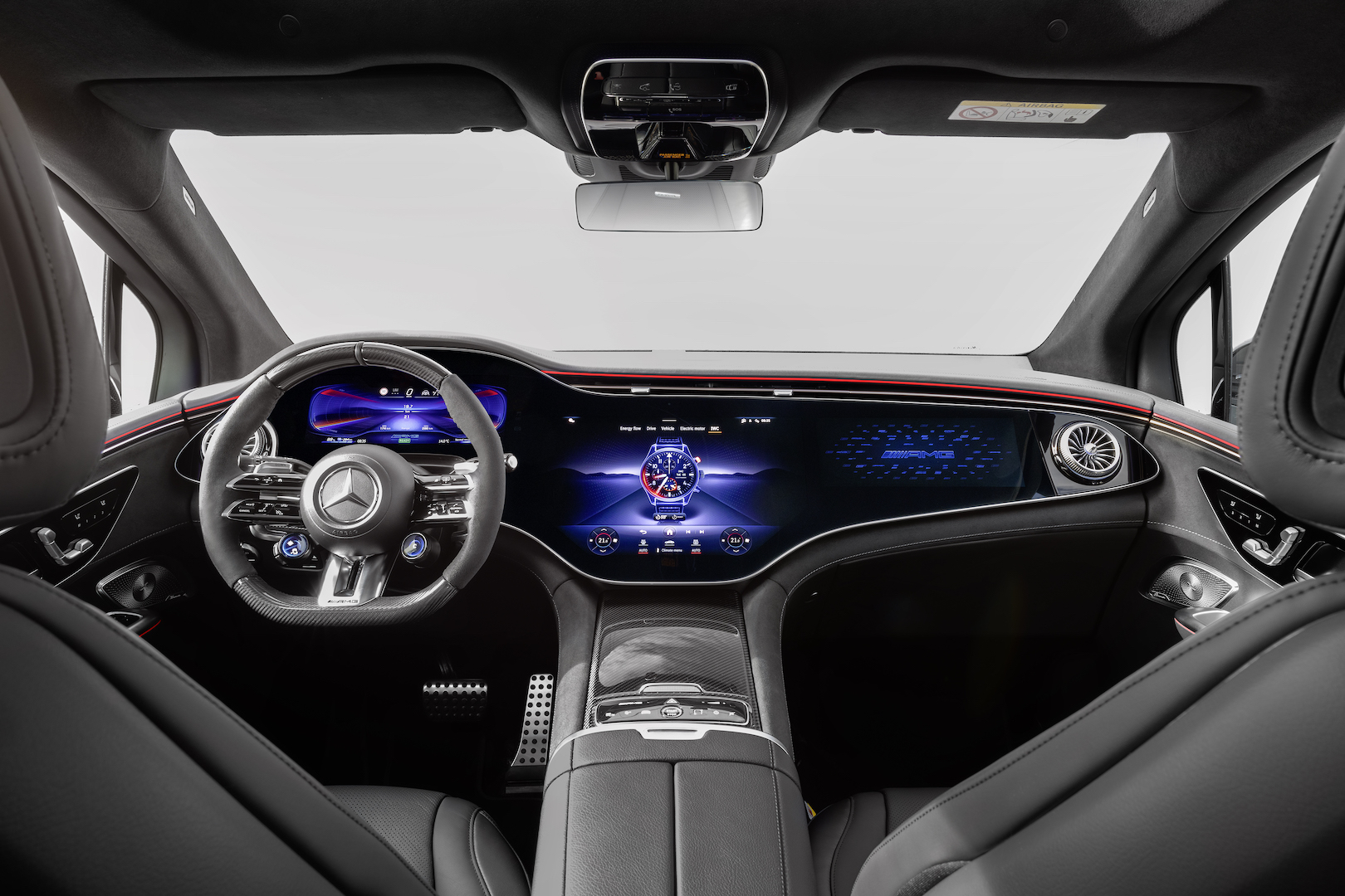 The AMG will visibly stand out from other EQE SUVs—even those with the AMG Line appearance package—as it has bumpers different from the wannabes, and 21- and 22-inch aero wheels to boost range. Inside, it gets sport front seats wrapped in MB-Tex faux leather as standard, while real Nappa leather is available as an option. There are AMG-specific pedals, floor mats, illuminated sill plates, and even an exclusive flat-bottomed steering wheel in case the carbon fiber accents don’t remind you this is the spicy boy of the EQ SUV lineup. The dash-spanning Hyperscreen is also an option (dunno why you’d want it), and with that Dynamic Plus Package installed, the infotainment gets performance gizmos like a stopwatch and G-meter. Also, apropos of nothing, it can tow up to 3,968 pounds.