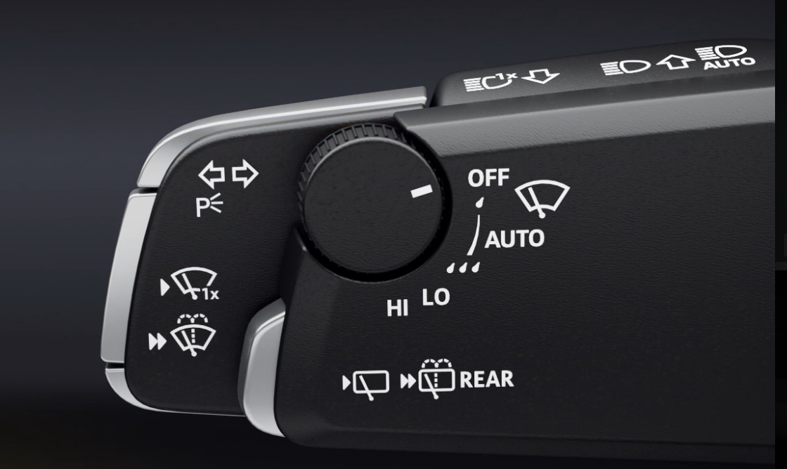 The left stalk-like piece of black plastic integrates the light functions and windshield washer controls. Pushing the plastic nub in engages the windshield wipers, while a double press will clean the windshield with fluid. A separate, itty-bitty silver plastic nub inset from the main lever on the left side performs the same functions, but for the rear window. Toggling the controls up or down engages the turn signals, and pushing the nub back engages the high beams and automatic high beam control.