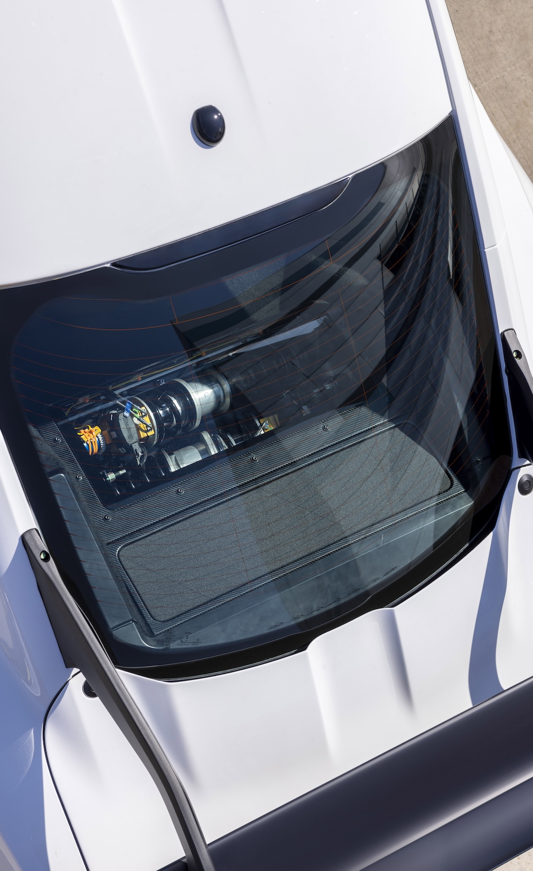 We spotted these standbys of every shadetree mechanic through the suspension display window in the rear of the Mustang GTD’s cabin, as shown in newly released photos. This 24-by-10-inch polycarbonate panel is included to show off the GTD’s semi-active rear suspension, which is mounted inboard and actuated by pushrods for optimal weight distribution. It uses dual springs and hydraulics to adjust ride height and firmness, and Multimatic Adaptive Spool Valve dampers to control body movement. These dampers can switch from their softest to firmest settings in 15 milliseconds, making them ideal for every feasible track condition.