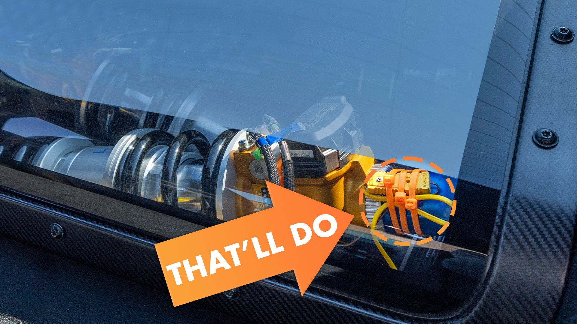 Look closely at the assembly to the right in the photo above and you’ll note some sort of yellow wire held to the suspension with three bright orange bands. Those are definitely zip ties, which many of us know as the last resort of some of the jankiest mechanics out there. But they’re more appropriate in the expensive, high-tech Mustang GTD than they might seem at first.