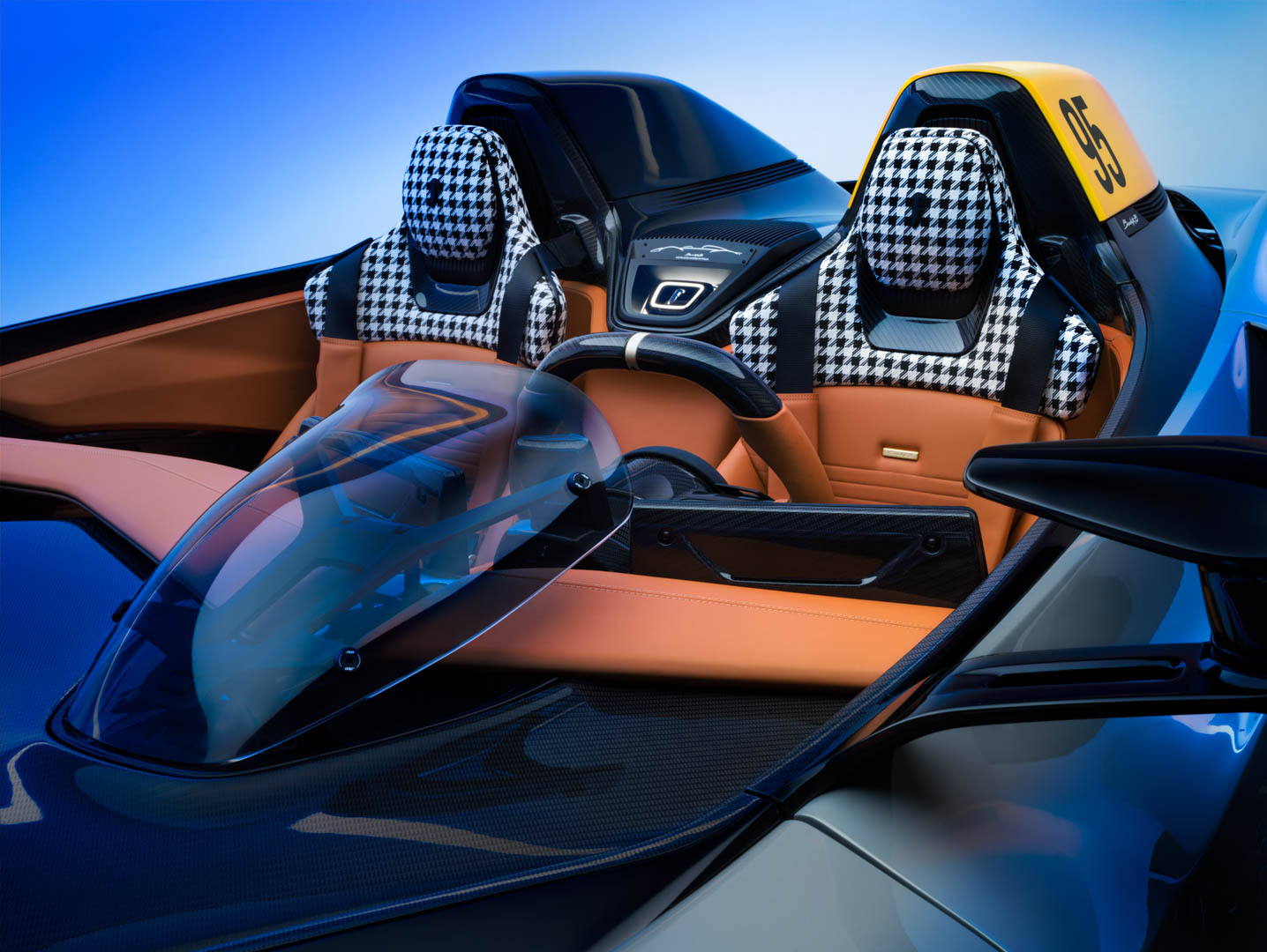 Despite sharing clear familiarity with the Battista, the Pininfarina B95 looks like if Italians tried to make a BAC Mono competitor, with its roofless design and dual rollover humps. The front hood intake also now has long strakes, which may help with aero but are probably just there because they look cool. Inside, the B95’s cabin is mostly the same as the Battista’s, save for its gorgeous seats, with their upper houndstooth design made from sustainable fabric. However, where the Battista had normal seatbelts, the B95 has four-point harnesses with leather shoulder straps.