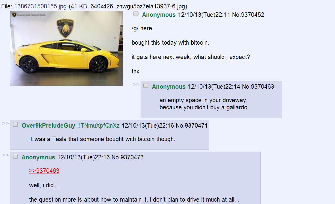 As I mentioned above, 2013 was a good year for early Bitcoin adopters. It was one of the first huge spikes in the coin’s value and brought a lot of new money riches into the pockets of investors. One of these investors happened to be a 4Chan user, who announced his purchase of a brand new Lamborghini Gallardo on the forum’s technology board.
