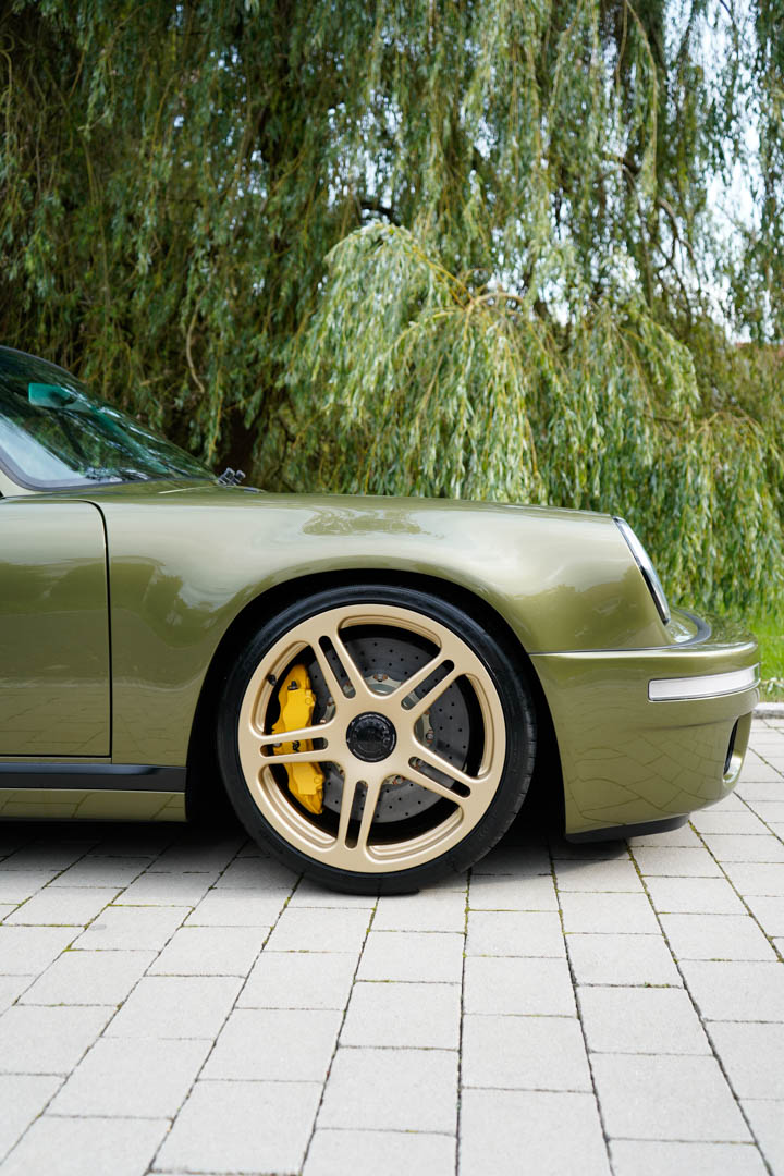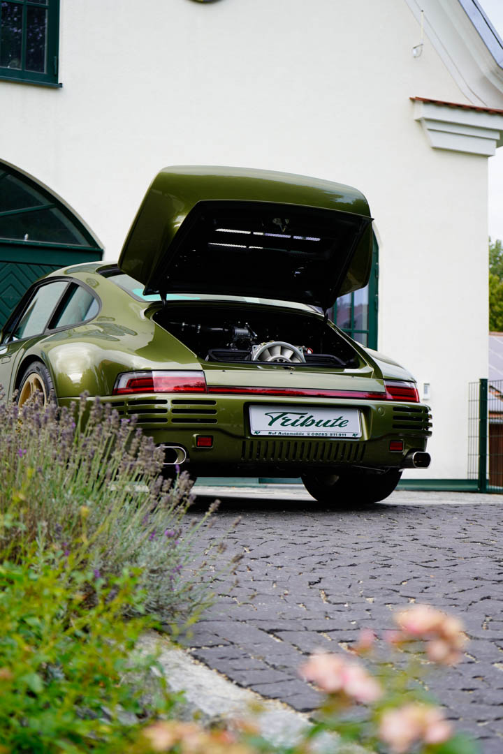 The Tribute is built on the same carbon-fiber monocoque as the RUF CTR Anniversary, the brand’s homage to its own iconic Yellowbird of the 1980s. Also like the CTR Anniversary, the Tribute has the classic G-body Porsche 911 silhouette, wide hips, five double-spoke center-locking wheels, rear bumper vents, rear fender intakes, and whale-tail rear wing. It also sports an integrated roll cage, to stiffen the structure and add some on-track safety. However, rather than the CTR’s canary hue, the Tribute wears forest green.