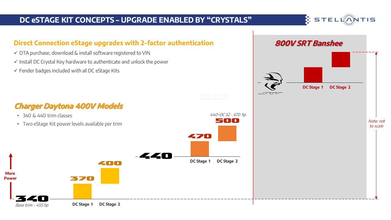 As for installing these upgrades, they won’t be issued through over-the-air updates, but rather a process that gets a bit… wook-ish. Dodge says it’ll unlock these performance upgrades through “crystals” (basically just chips) that plug into the dash. Their software is VIN-locked, so you won’t be able to lend it to a friend. It may help to think of them as being like the Hellcat’s red key, but for an EV, and it doesn’t come with the car.