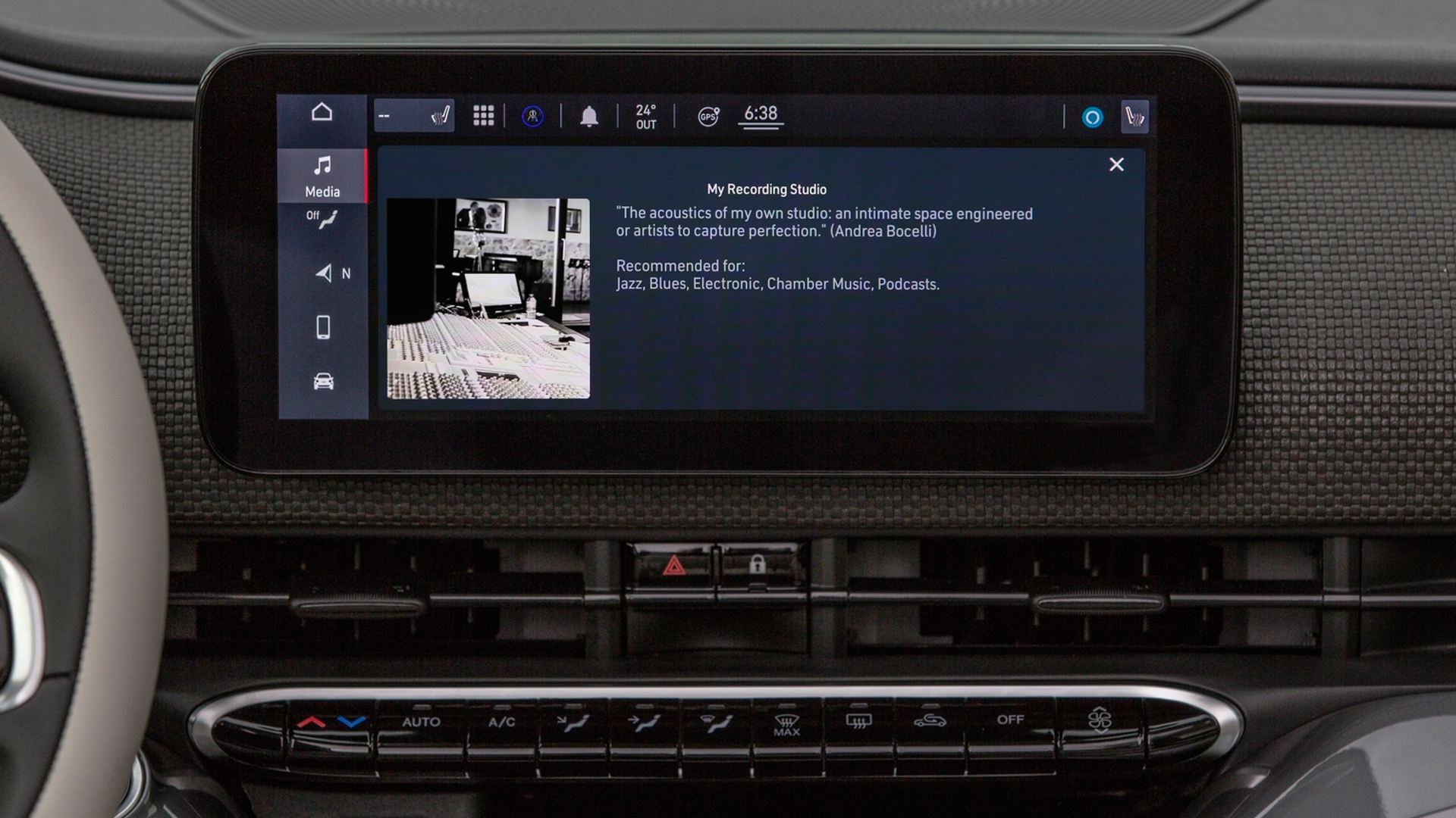 However, the Fiat 500e Inspired by Music only comes in Tuxedo Black—a standard 500e color—to match the vibe of Andrea Bocelli, who helped design its audio modes. Bocelli chose four different sound “venues” for the JBL sound system. Each one digitally changes the characteristics of the 500e’s sound system in an attempt to transport its passengers. There’s “Music Room,” which is meant to feel like the artist is in the room with you; “My Recording Studio,” which is supposed to sound like the inside of a recording studio; “Giuseppe Verdi Opera House, Pisa,” that gives a live performance-type feel; and “Open-Air Arena”—I’m sure you can guess what that one is supposed to sound like.