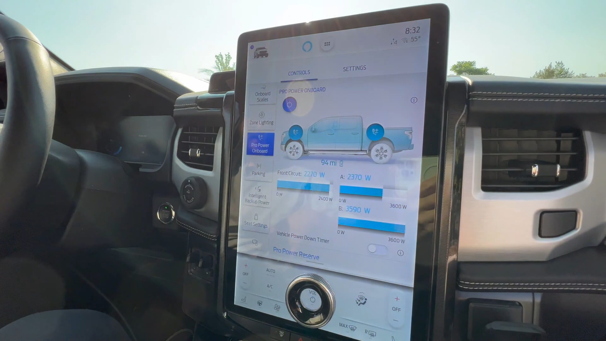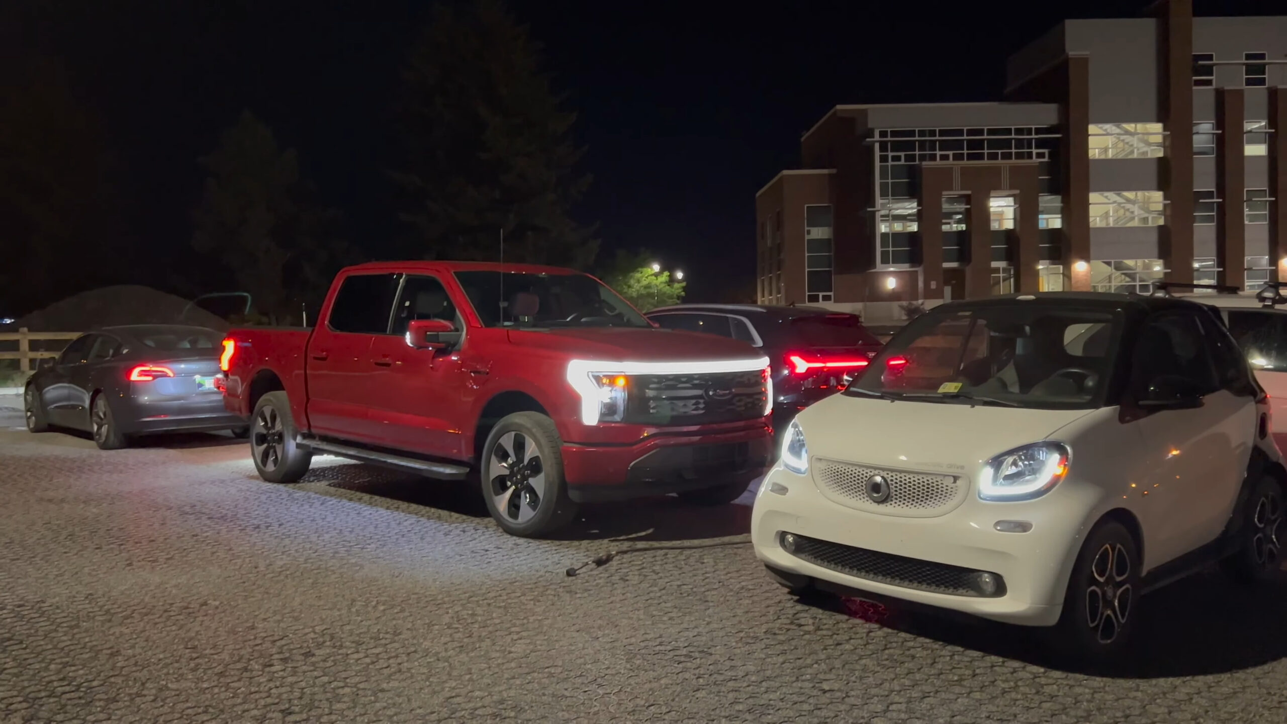 The cars were left overnight to suck up juice for 9 hours. To allow the test to run all night, the powerdown timer was disabled, and the Lightning was set to run the outlets until there were just 10 miles of range left in its own battery. The Lightning’s frunk was left propped open to avoid a power limit on the front circuit when the frunk is closed, presumably to avoid overheating. The risk of the truck being stolen was minimal, as the power outlets can be left running without the keys in the truck, preventing it from being started and driven away.