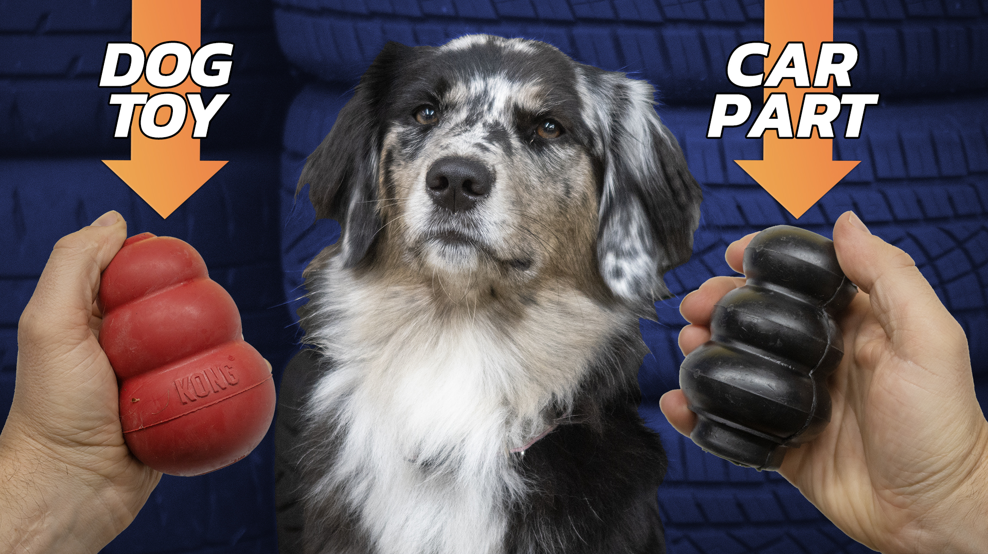 Looking at the dog toy and bump stop together, I found the visual similarity pretty funny. I mean, they look generally the same, just packaged differently. But the modern-day Kong toy is in fact a lot more malleable. The VW part is nearly rock-hard and bounces a little, but the Kong toy has some nice give to it and flies around excitedly when you drop it on a hard surface. It also has two holes, instead of just one, and a larger internal cavity for storing treats or peanut butter-like snackable spreads to keep a dog entertained for a very long time.