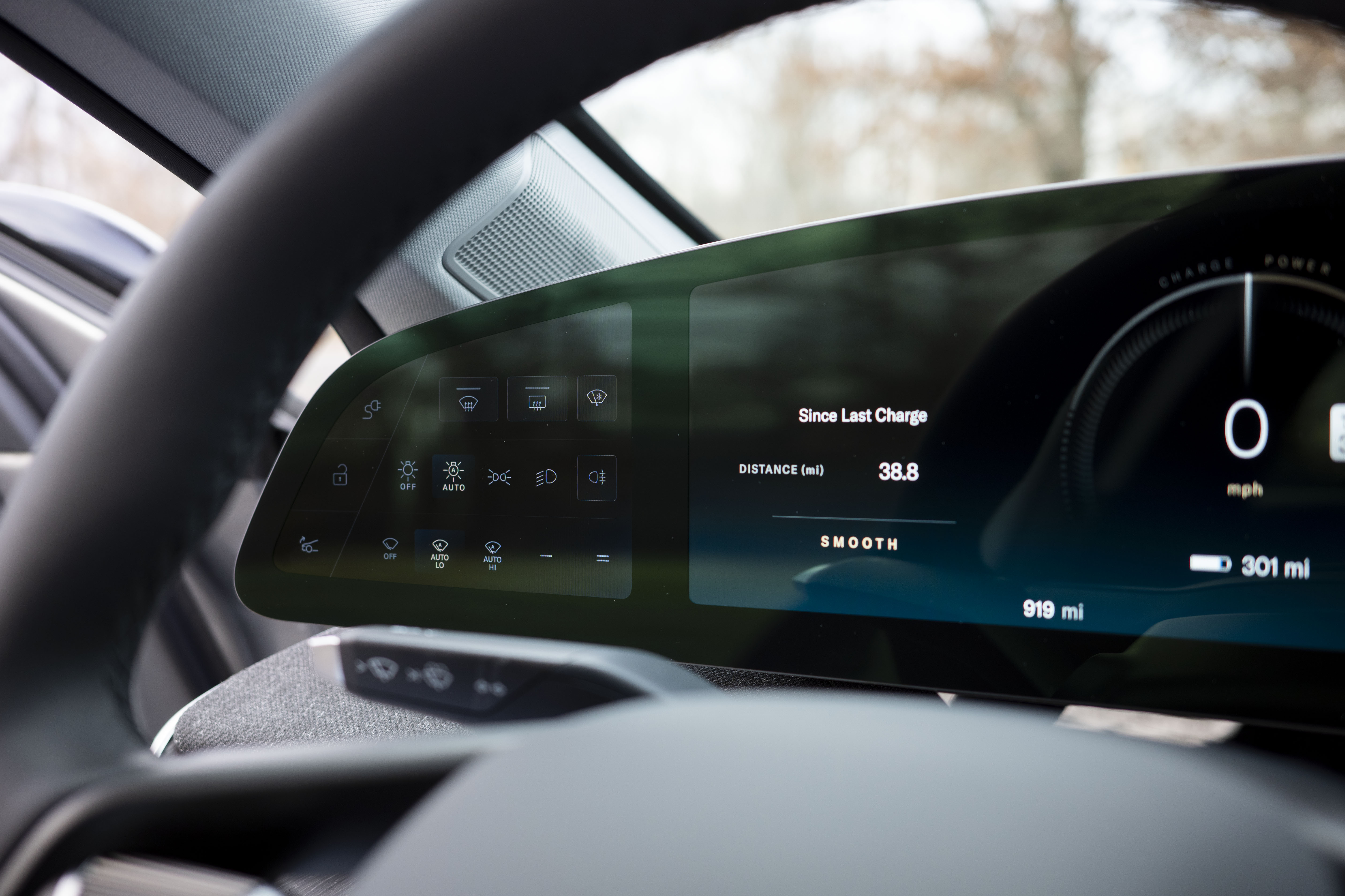 Lucid calls theirs the “Left Cockpit Panel,” which isn’t a terrible name for it, because it emphasizes how the placement of this screen is really important to its effectiveness. Basically, it encompasses all features ancillary to driving that are still nevertheless important—stuff like windshield wiper behavior, lights, and defogging, as well as opening and closing the charge door and frunk, because this is an EV. And the way Lucid has laid it out, as you can see in my photo below, is really straightforward.