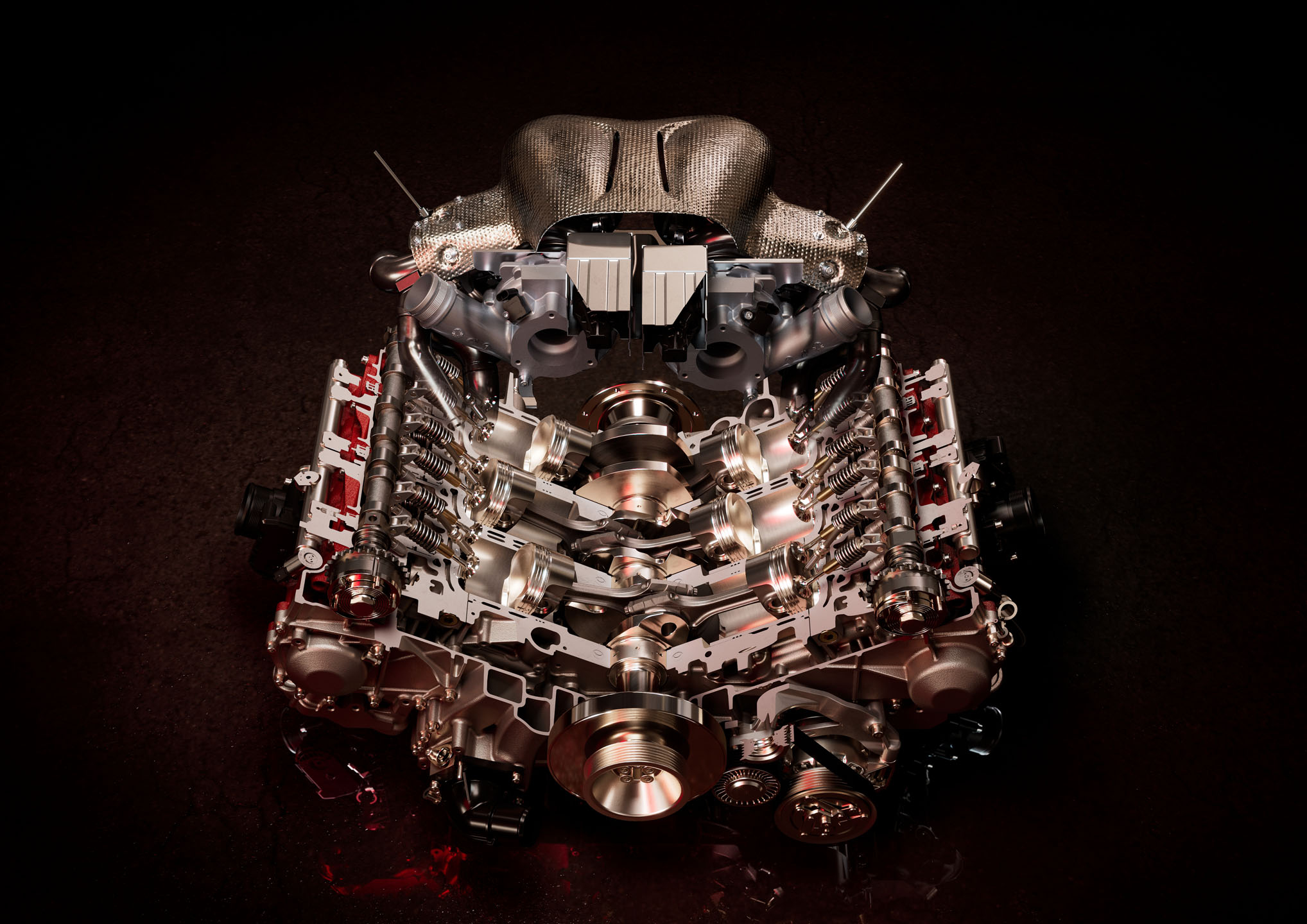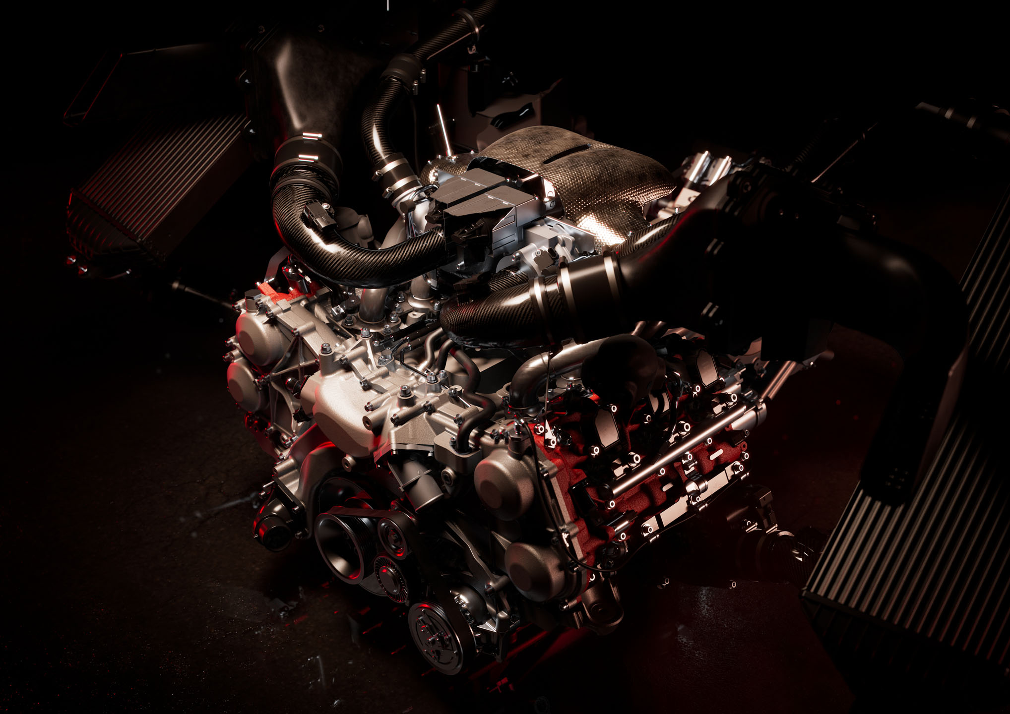 The GT3 version stuffs twin turbos between the V6’s wide cylinder banks that oppose each other by 120 degrees. Compared to the roadgoing version, the GT3’s engine is farther forward and lower, which lowers the center of gravity and increases torsional rigidity by 10%, according to Ferrari.