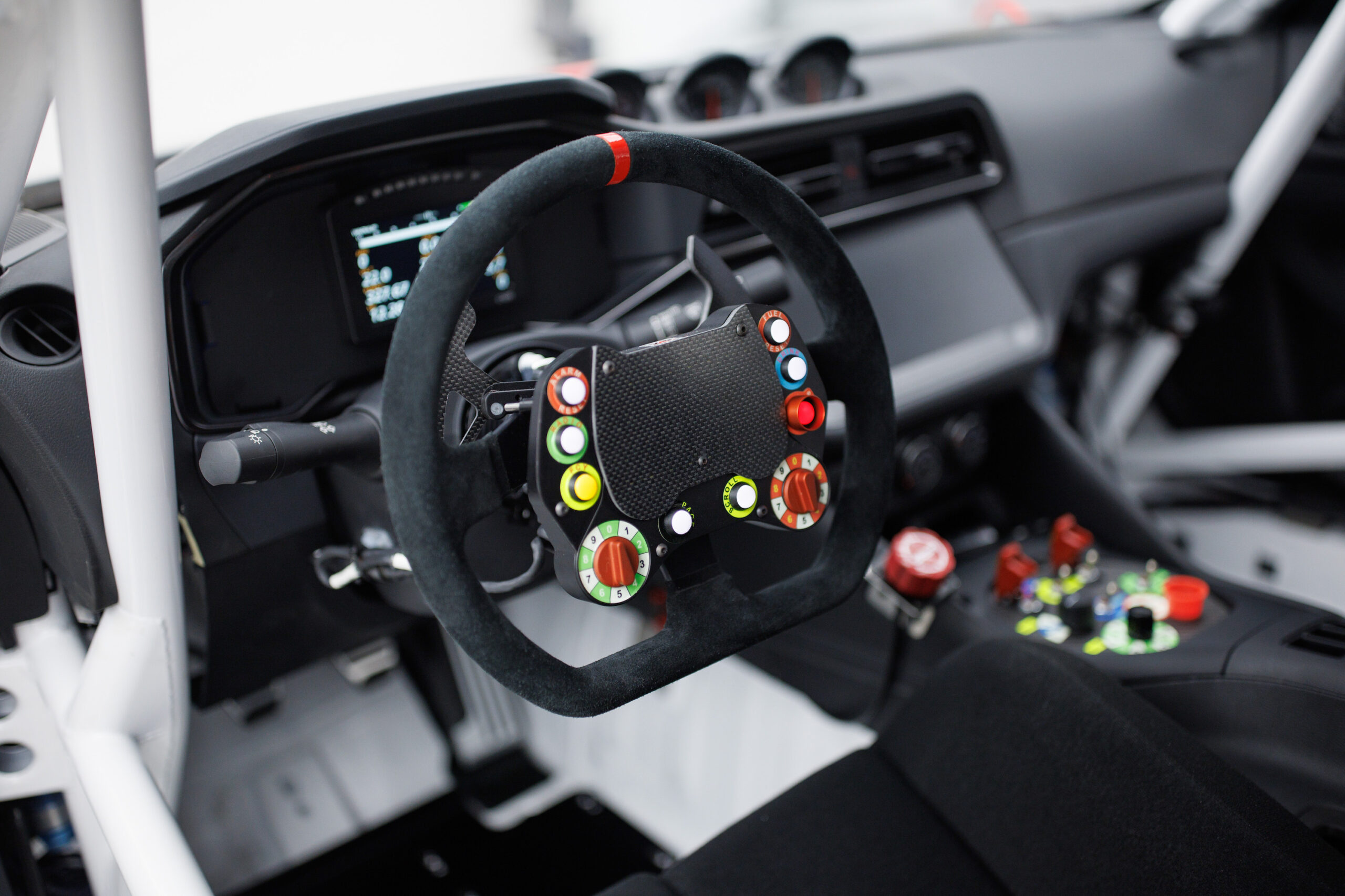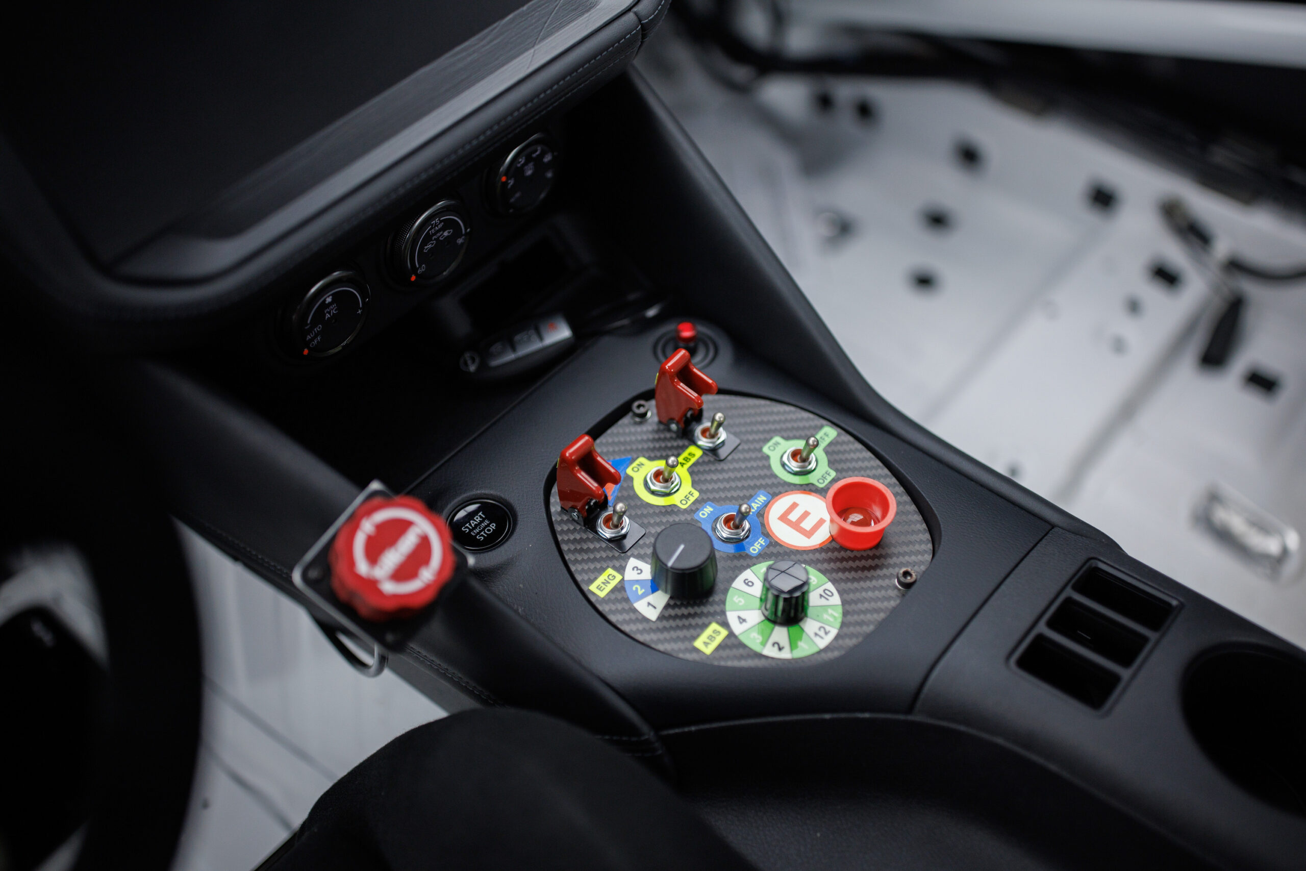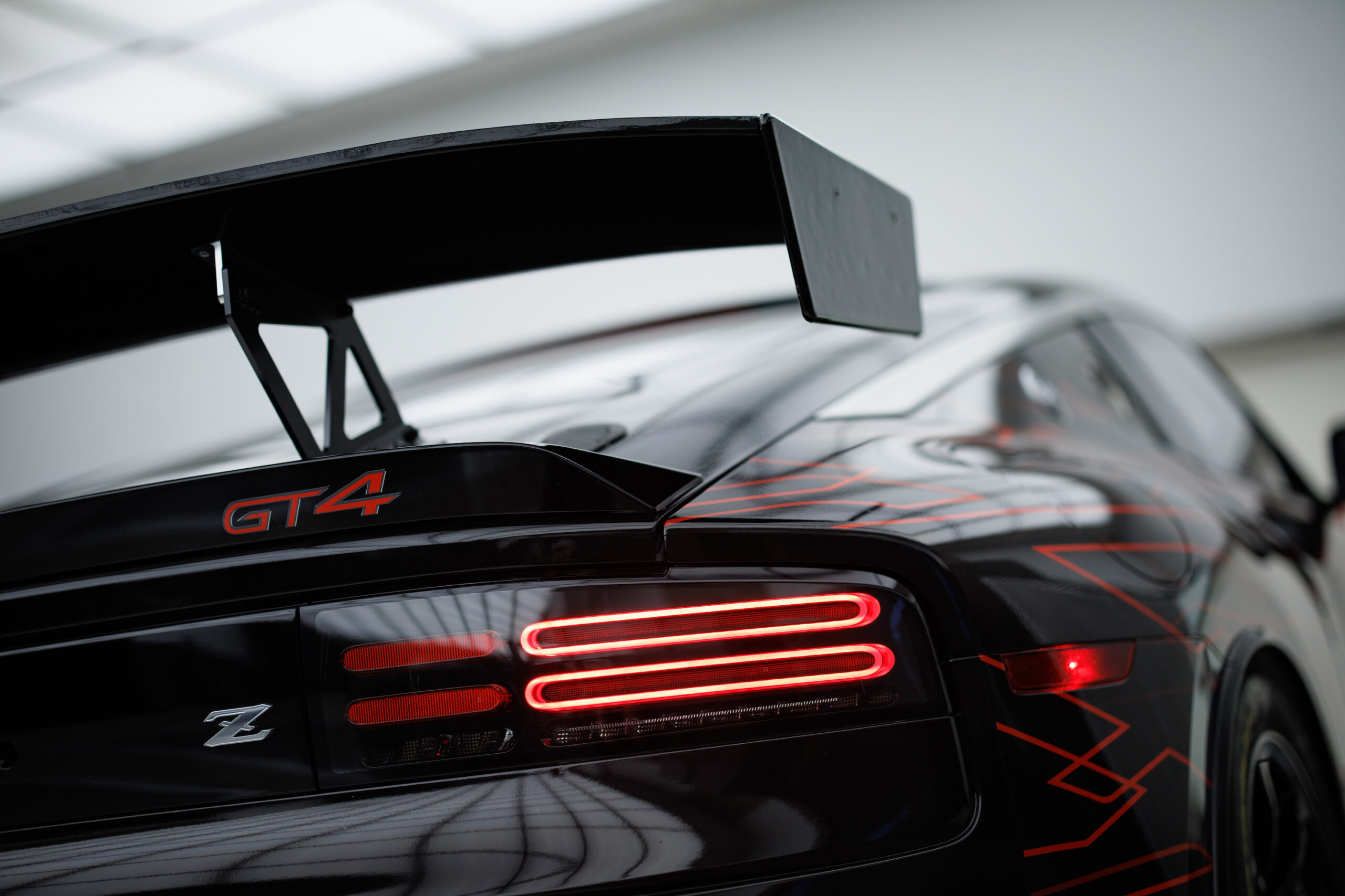 Inside, you can see that it’s fully caged and stripped out. But it’s still familiar to Z fans. The car maintains the trio of dash gauges, as well as the trio of climate controls beneath the screen and the circular door latches. Even the cupholder made it into the race version.