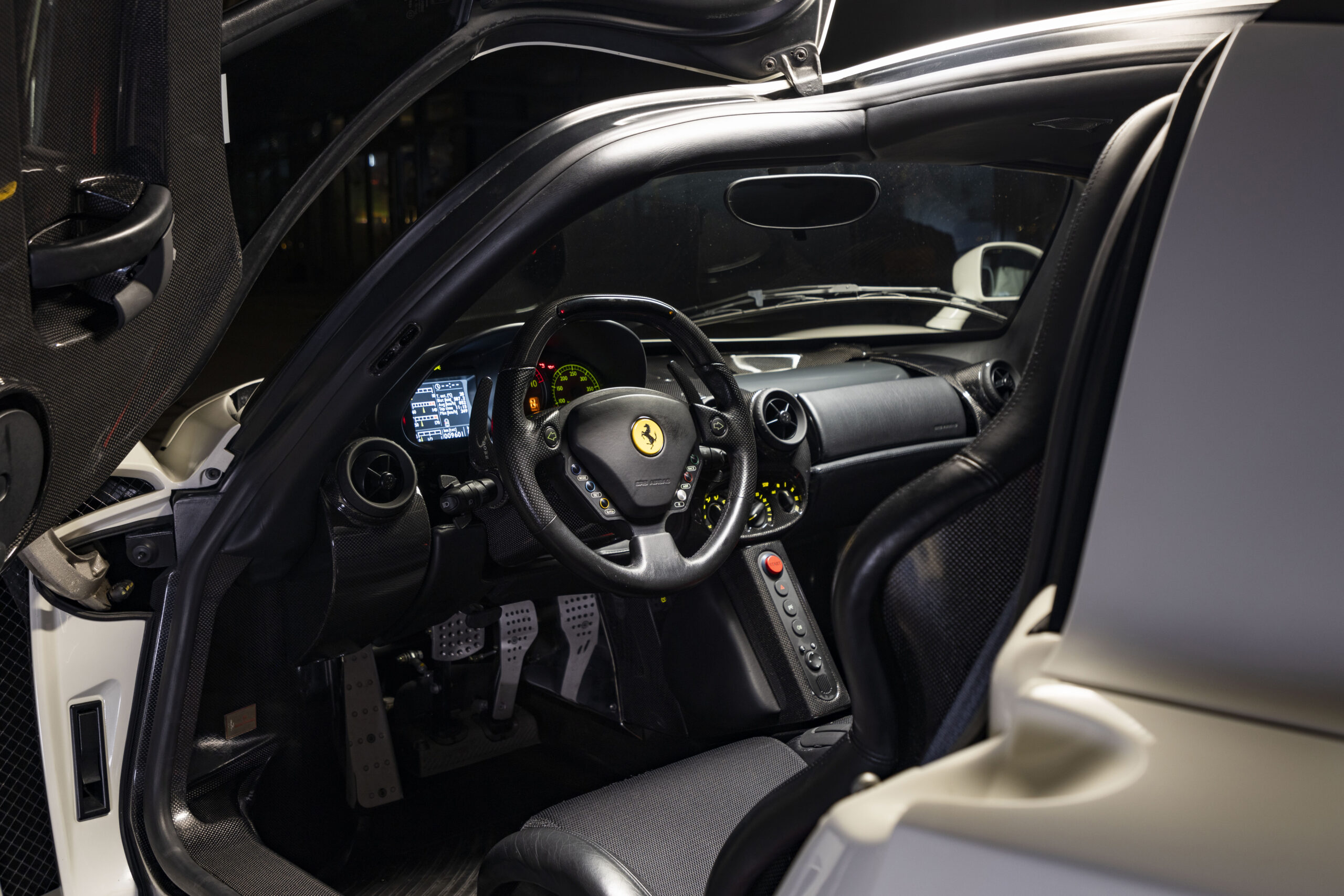 The one-of-one Enzo, known by its chassis number 133023, has rarely been seen since it was built in 2003. Finished in a shade named Bianco Avus, it’s the only Enzo that was ever delivered in white. It’s being offered up for auction with just 9,600 km on the clock (or about 6,000 miles) and had its annual service performed in March this year.