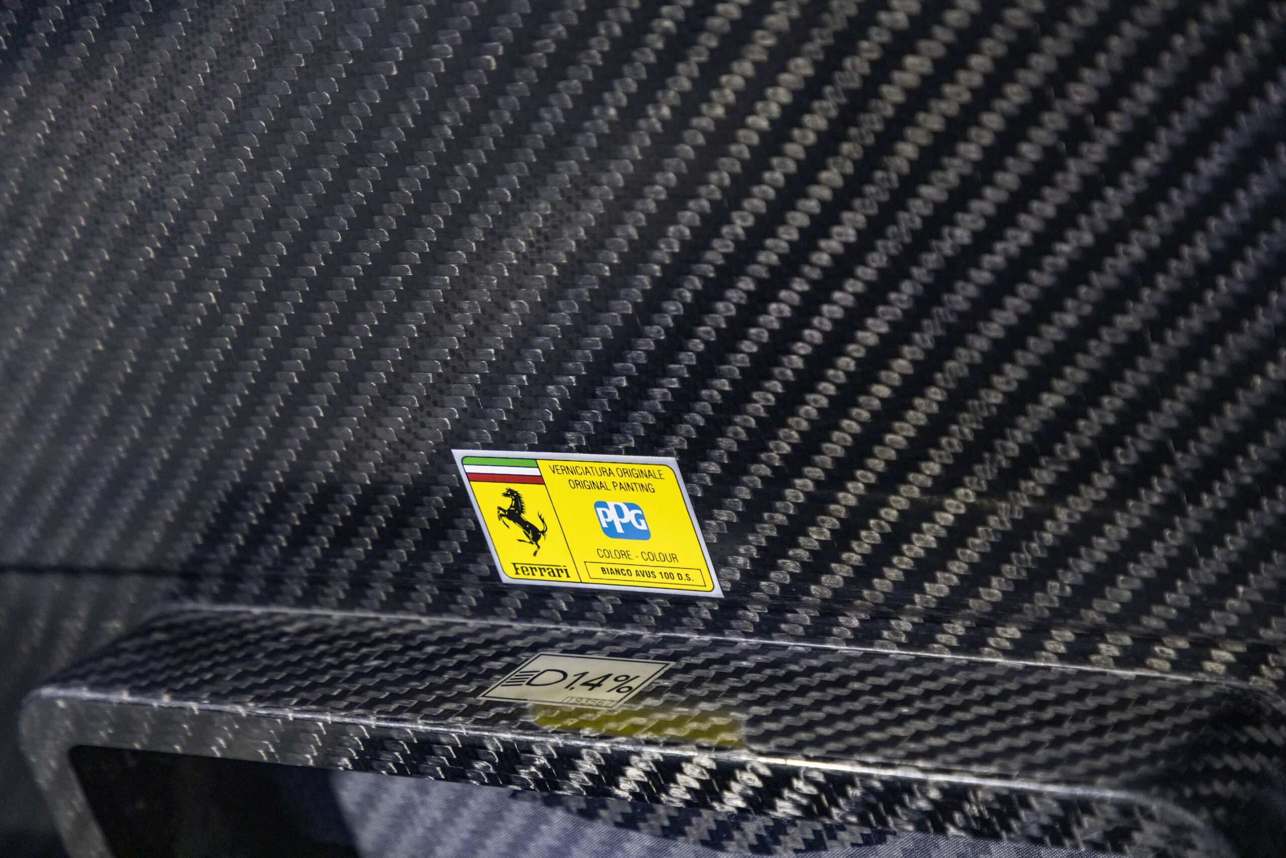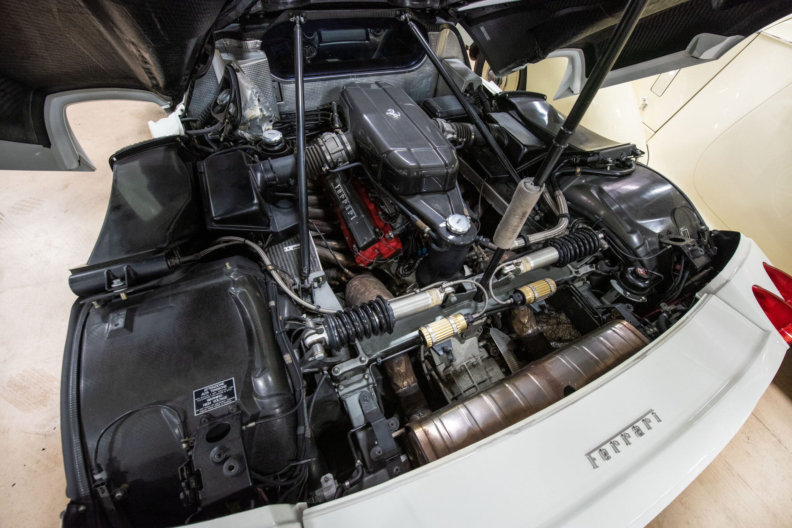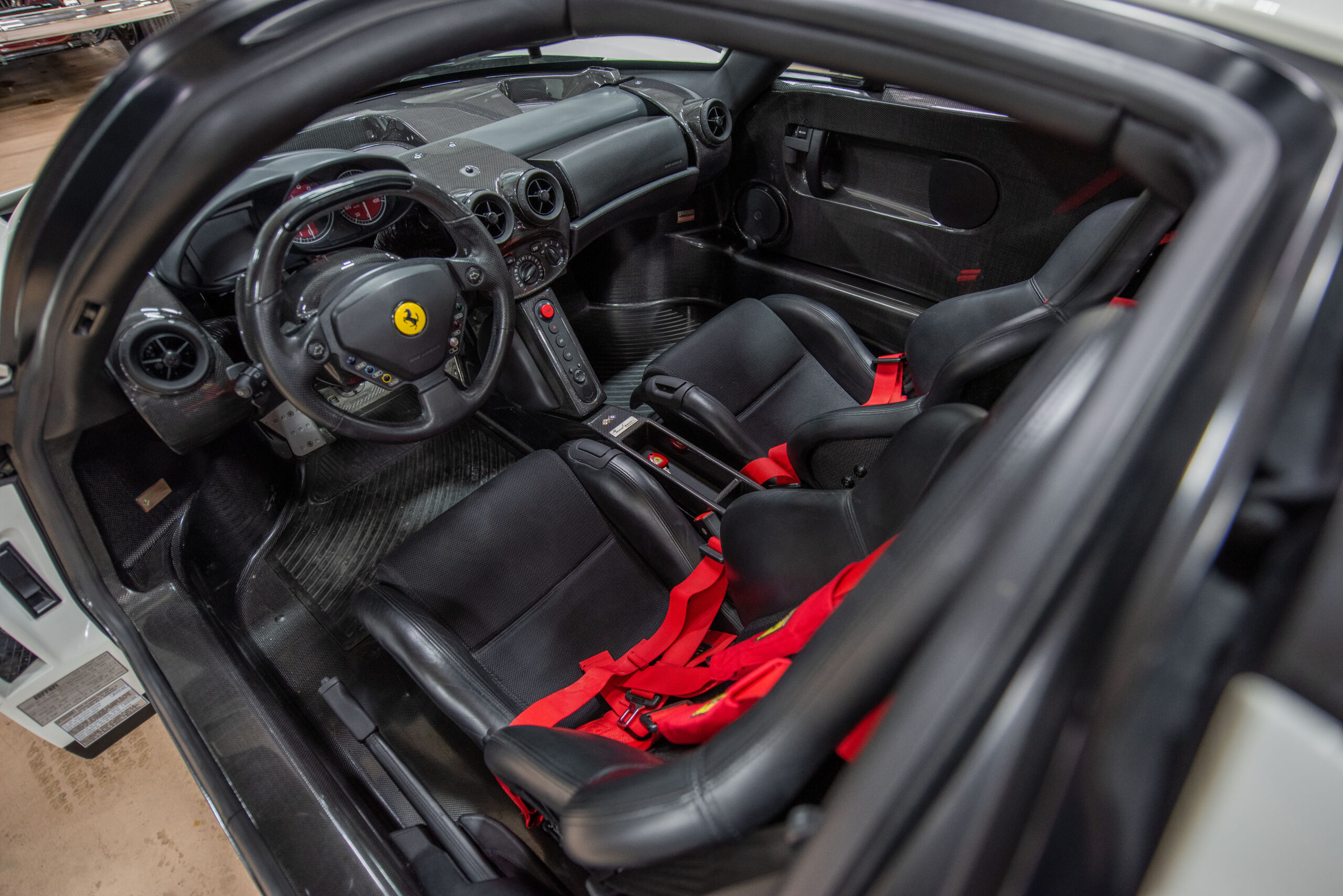 The striking white finish is paired with a black leather interior. The dash instruments are finished in Rosso Corsa, while the interior also features extra-large carbon buckets with rare black cloth inserts. Purists will be glad to know the vehicle comes complete with its “Red Book” from the Ferrari Classiche department. This confirms the vehicle’s condition and its matching-numbers status, as determined by Ferrari’s own personnel.