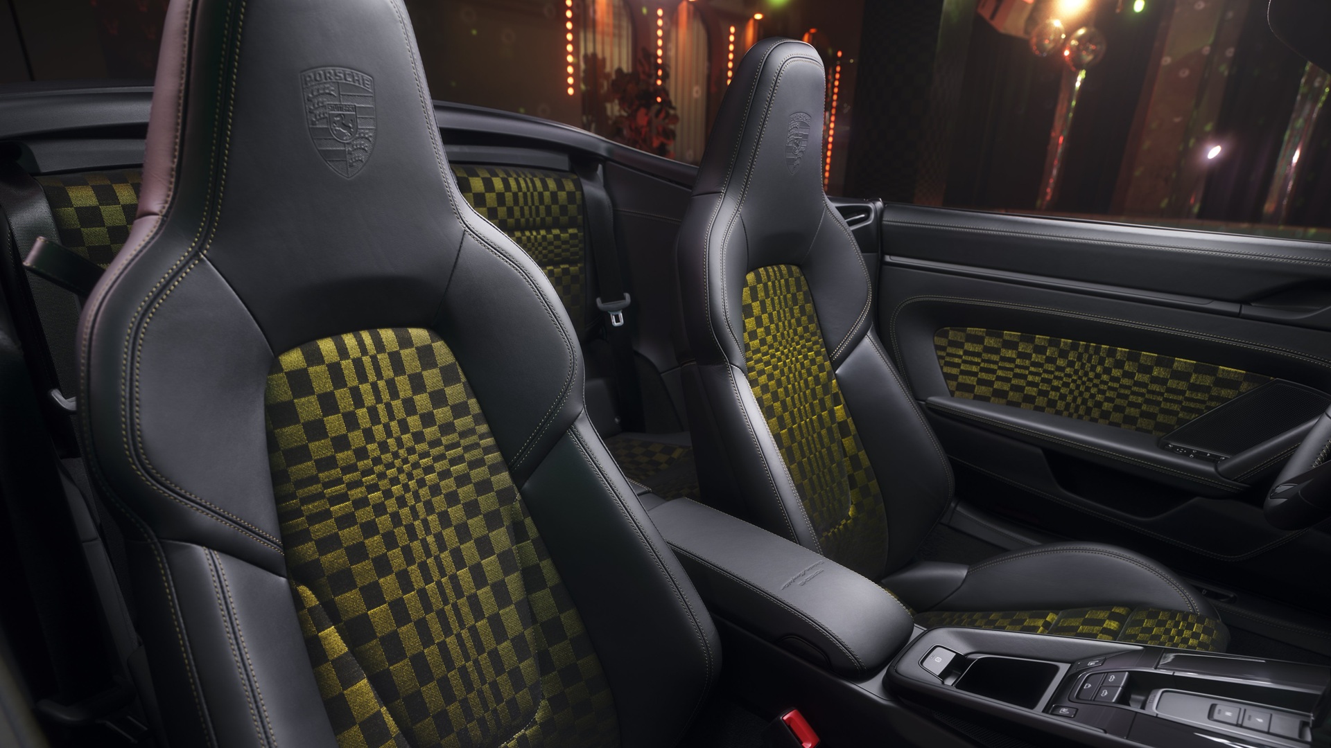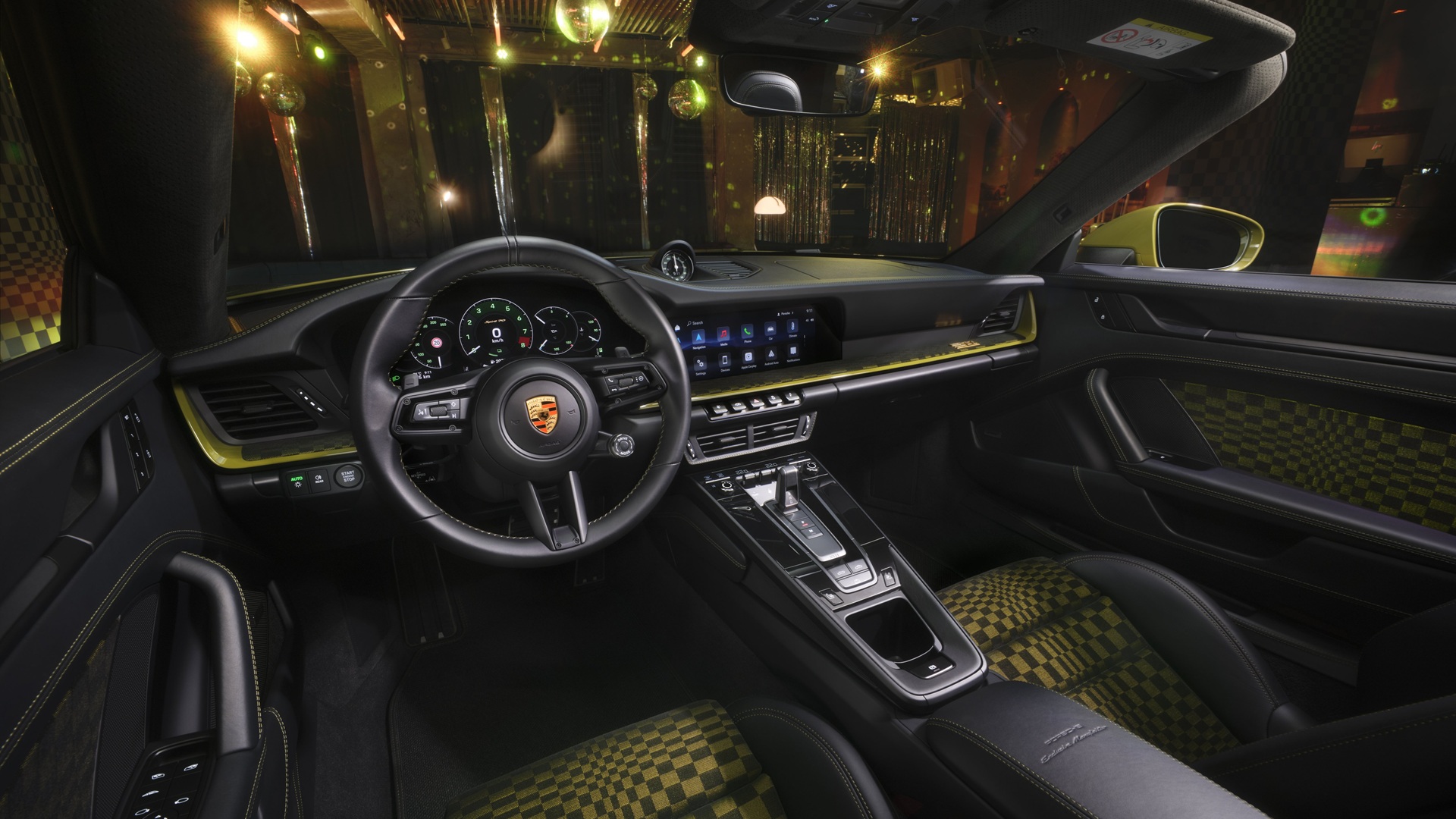 Inside, the unquestionable highlight is a patterned, black and Olive Neo upholstery called Pasha. You might have seen this seat pattern on cars from 50 years ago, and of course, Porsche nerds will know it well.