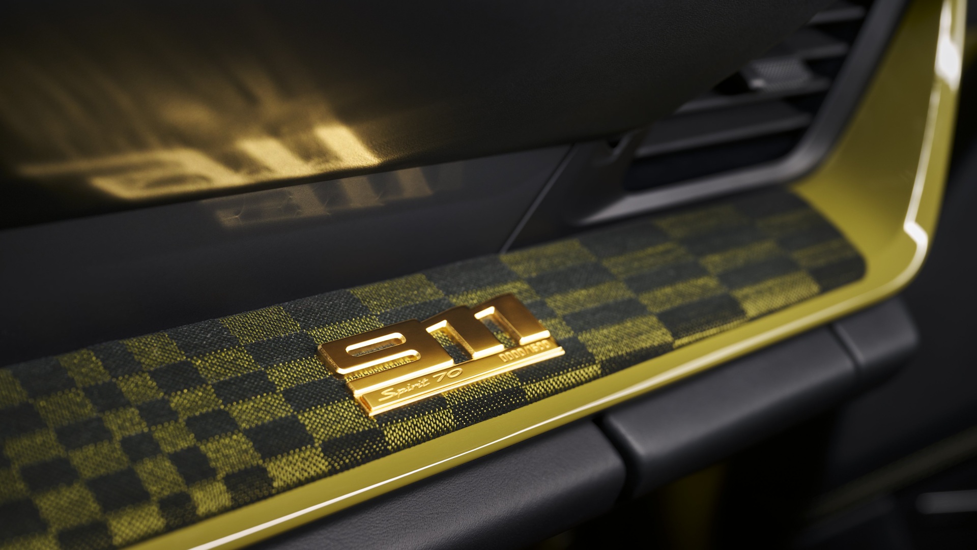 Porsche revived it for this special model, added it to the center of the seats, the dashboard, the glovebox, and the door panels. It’s one of the coolest upholstery designs we’ve seen in a 911 in recent memory, and we’re told that the material was designed to be more comfortable to sit on than the cloth Porsche used in the 1970s. There’s a numbered plaque on the passenger’s side of the dashboard, and the digital instrument cluster stands out with green digits and the “Spirit 70” logo in the tach.