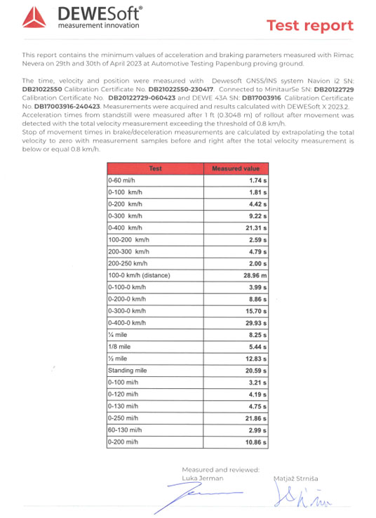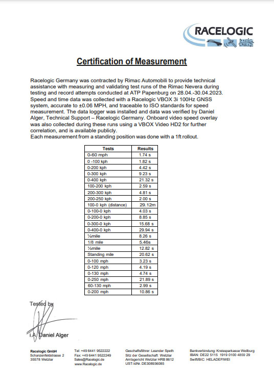 The pace of the Nevera cannot be understated. It runs a 1/2 mile drag in just 12.83 seconds, which is considered a relatively quick time down a quarter-mile by combustion car standards. A new 400-horsepower Nissan Z runs in the neighborhood of 13 seconds, for instance. A full list of the car’s recent achievements as well as the verified Racelogic and Dewesoft figures can be seen below.