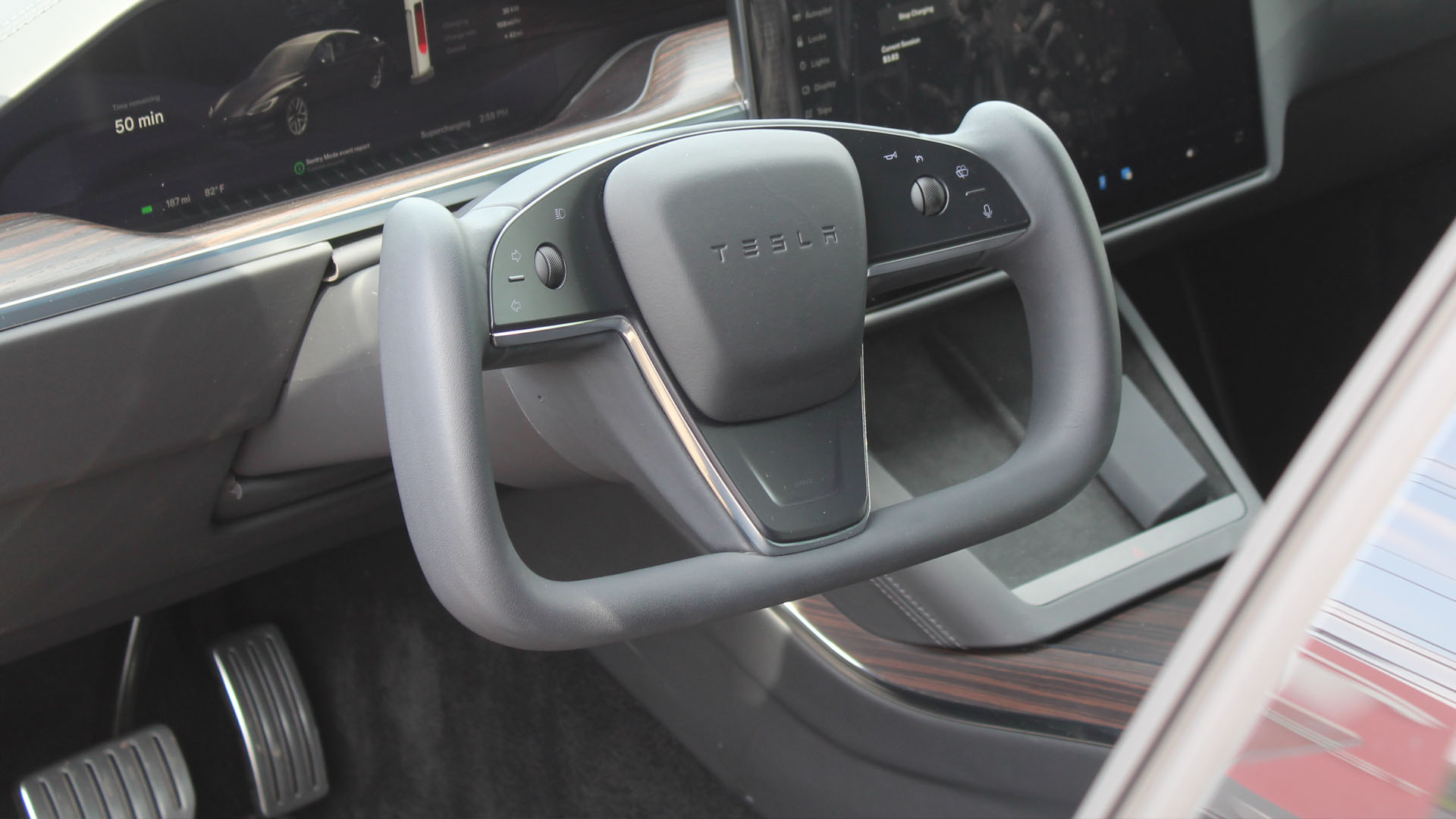 There’s no official answer as to what the “worm” is but some owners seem to think that it’s the airbag cutaway that can be seen through the faux-leather cover. Since the worm is exactly the same on every yoke, that explanation seems likely. Some are more subtle than others, with some looking like a wrinkle in the material and others looking like a full-on Snickers vein. Either way, it’s unacceptable in a six-figure electric luxury car.