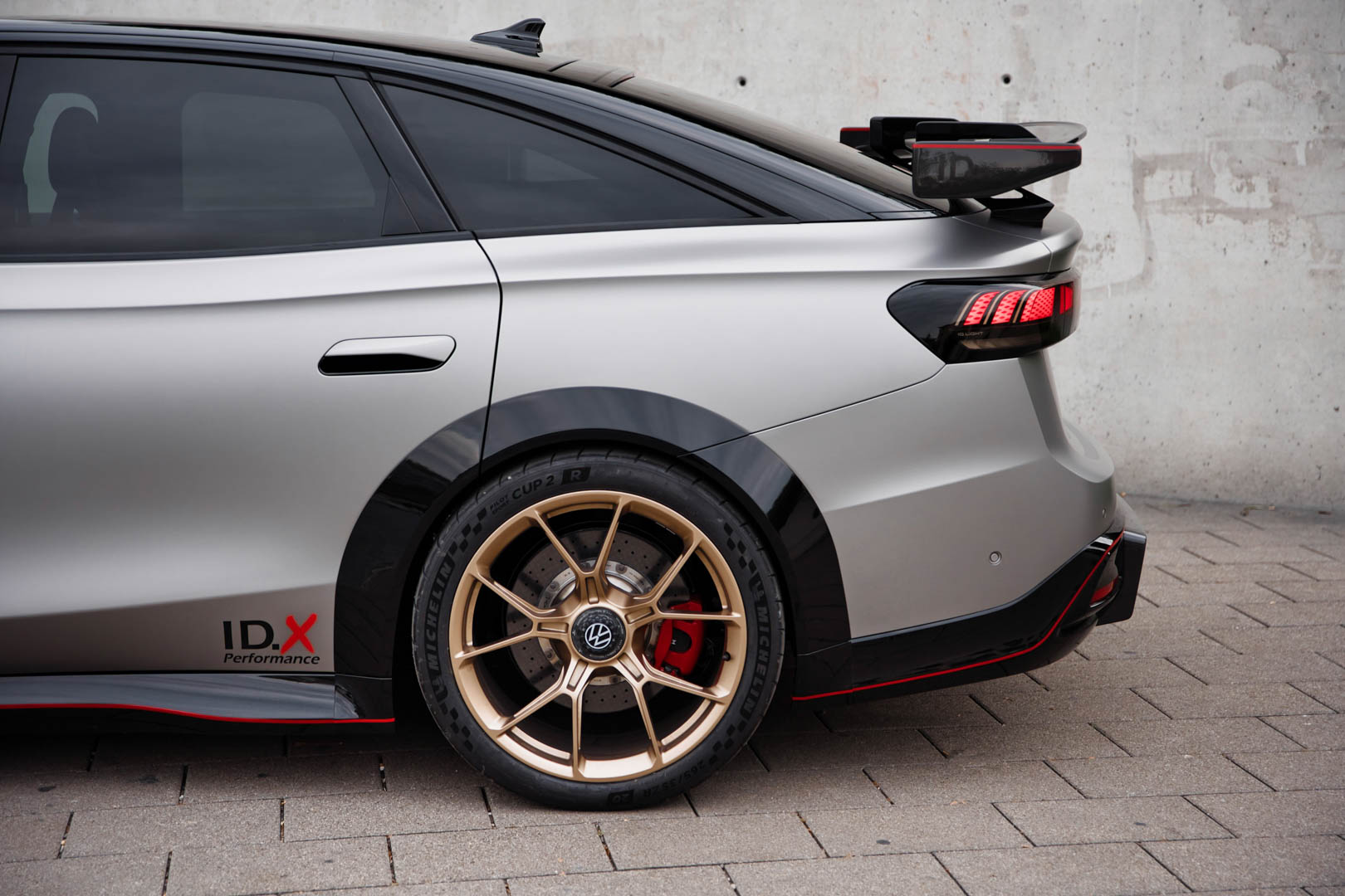 Inside those flared wheel arches are 20-inch center-locking wheels that seem plucked from a Porsche 911 GT3 and painted bronze. They’re also wrapped in ultra-sticky Michelin Pilot Cup 2 R tires, which are an available dealer option on the 911 GT3. Porsche might not love seeing its GT3 wheels on an electric Volkswagen but seeing the VW symbol on center locking wheels is really fun and I sincerely hope a future performance ID.7 gets them at some point.