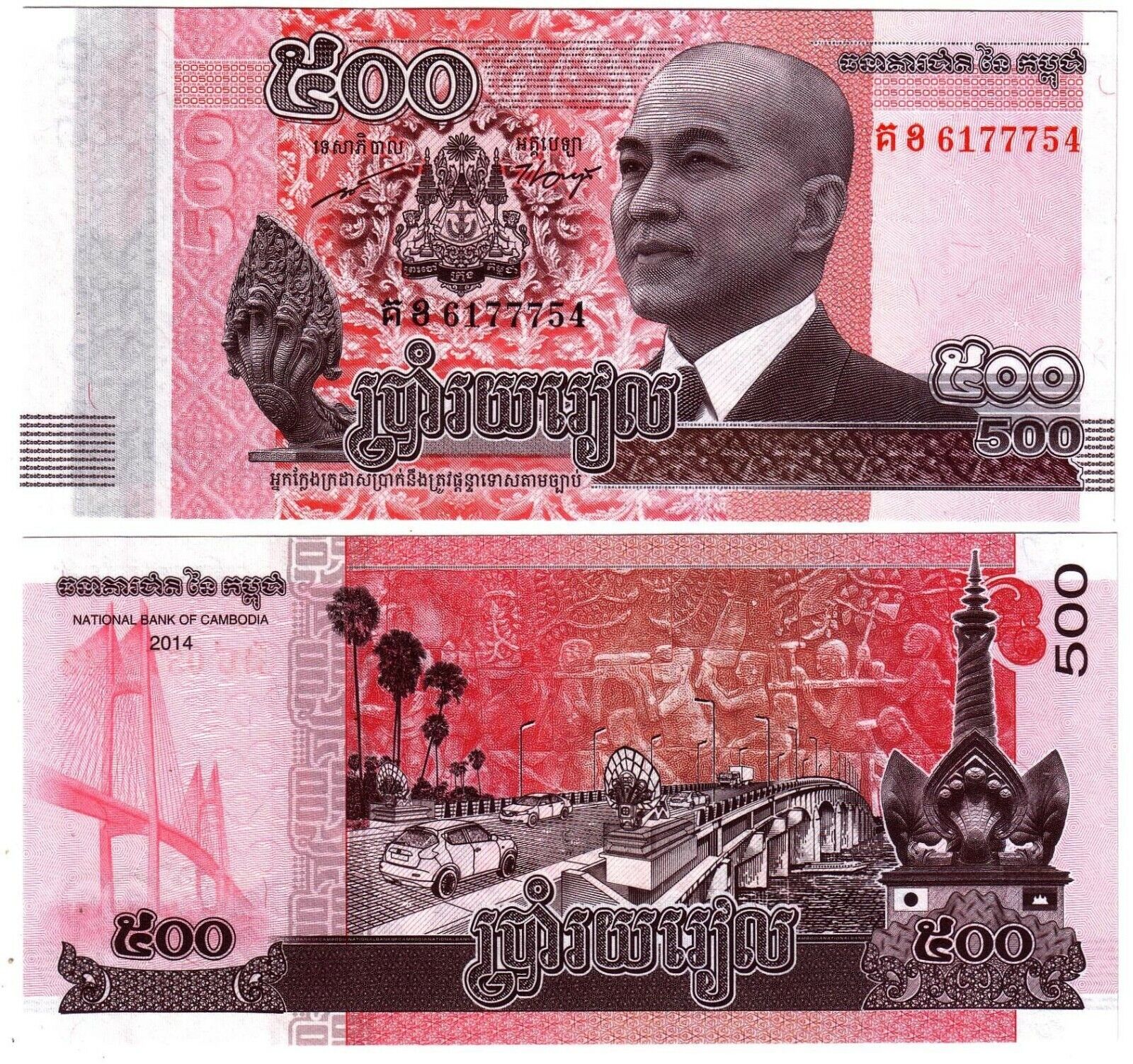 On the obverse side, the 500 riel banknote depicts the King of Cambodia, Norodom Sihamoni. Also shown are the five-headed mythical Naga snake and the Royal arms of Cambodia.