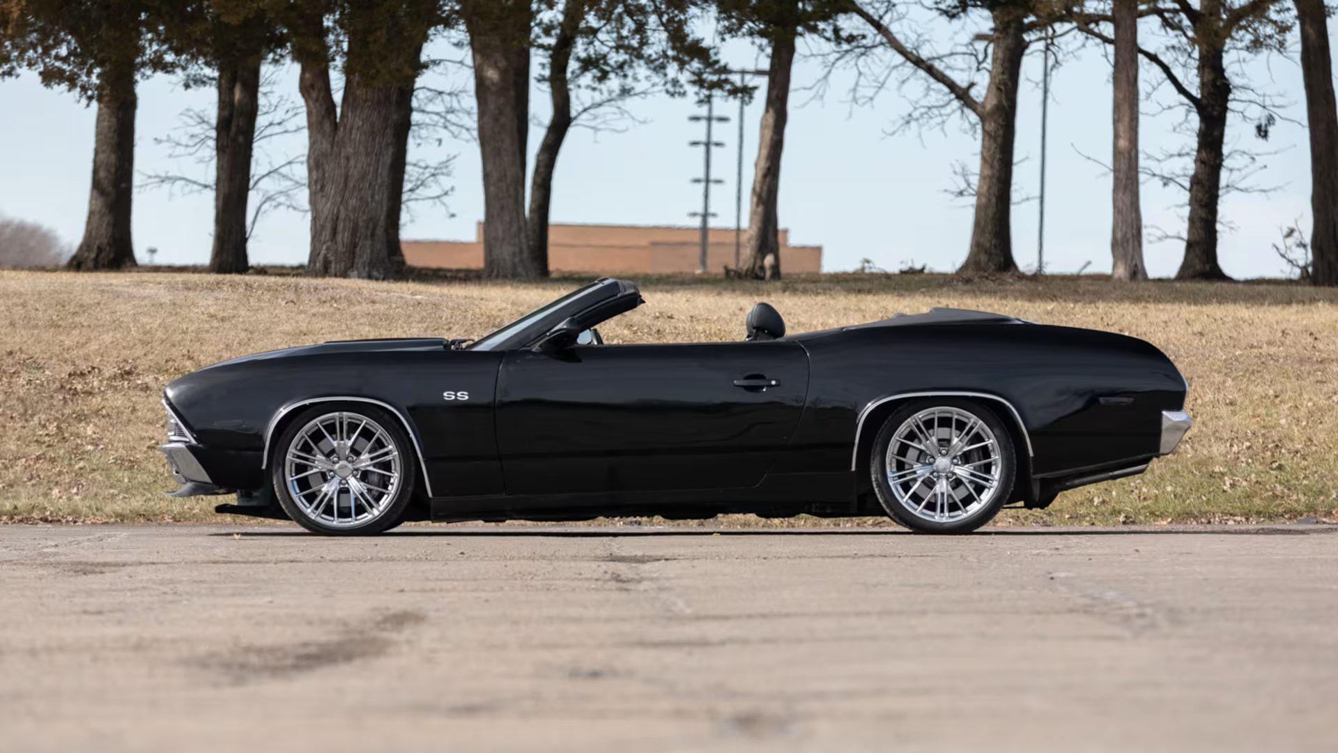 The body is a custom job made from carbon-fiber-reinforced fiberglass. Under the hood, you’ll find GM’s 6.2-liter V8 mated to an automatic transmission. Hey, it’s a drop-top Chevelle—not a 911 GT3. We’ll let it slide. You do get a set of adjustable coil-overs, for whatever that’s worth.