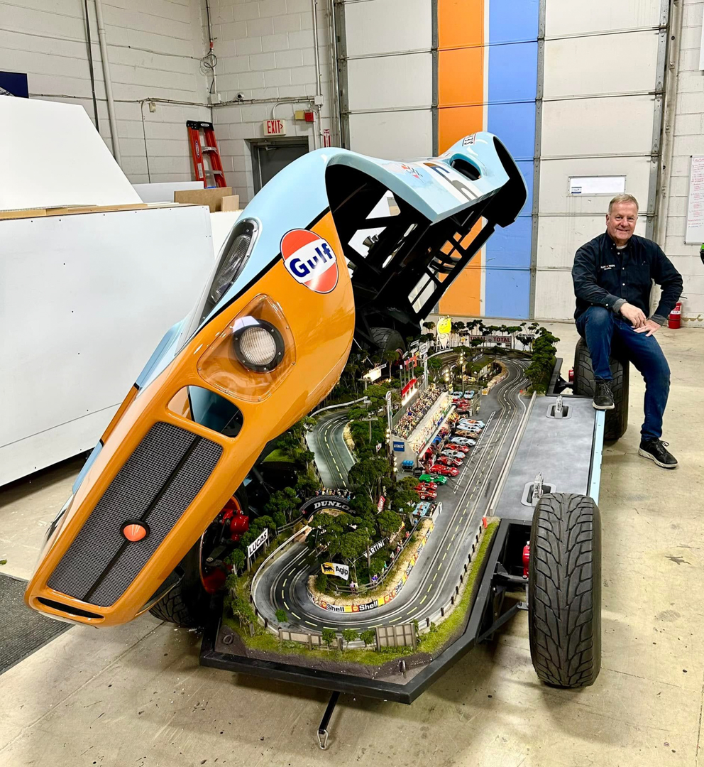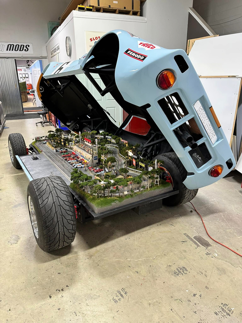 Slot Mods Raceways is back with a new handmade slot car track that hides inside a vintage car. A couple of years ago, one of Slot Mods’ most popular creations—a circuit built into the body of a replica Porsche 917—sold on Bring a Trailer for an astonishing $205,000. Now, the Detroit-based company has a new model, with another famous racing legend wearing those signature Gulf colors.