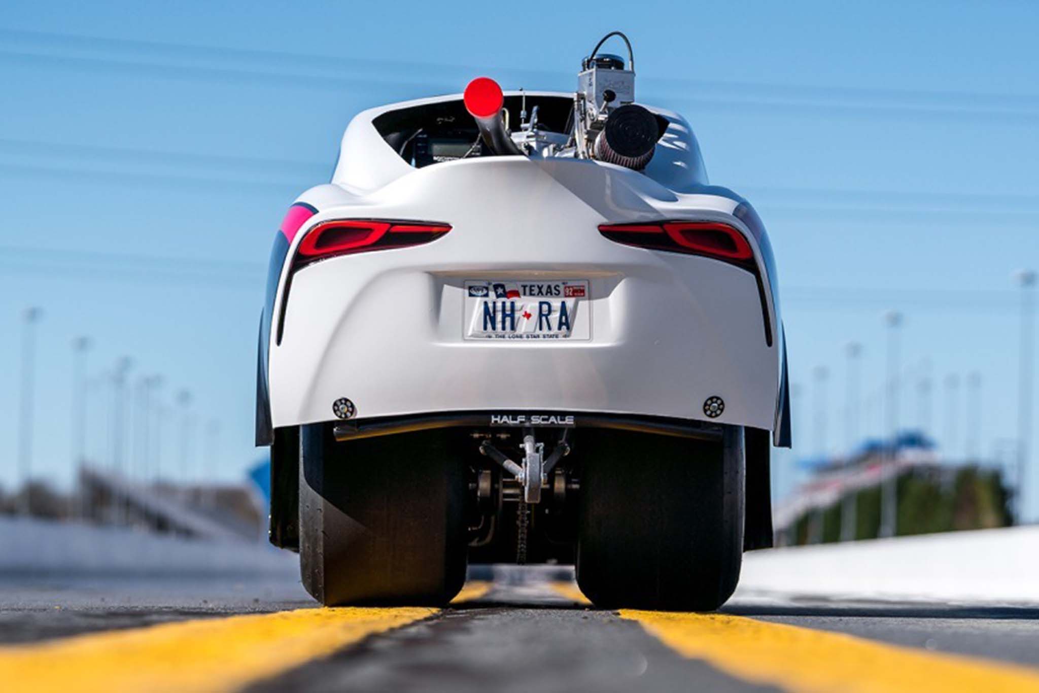 Toyota told me there’s no spec engine for the JDRL Supra, but Half Scale offers a catalog of options. No matter which you pick, it’ll be mounted behind the driver. That’s different from the Funny Car, but rest assured the little guy learns a lot of lessons from its big brother. There’s still a hoop above the cockpit for rollover protection as well as a wheelie bar out back. The design is obviously similar, save for the Funny Car’s zoomie headers that pop out the side and its wings that square off the rear flanks.