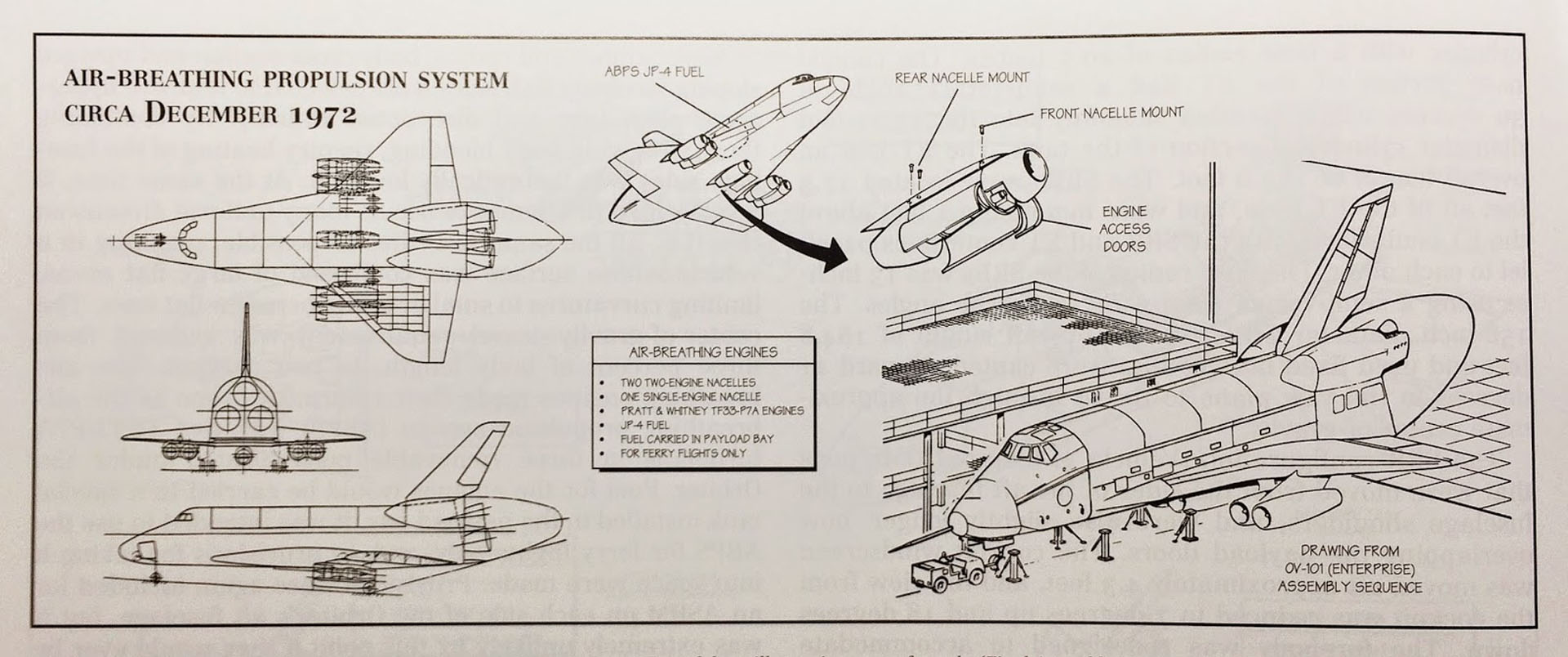 The jet engines actually stuck around on the shuttle concept for some time until they were eventually removed in the final design.