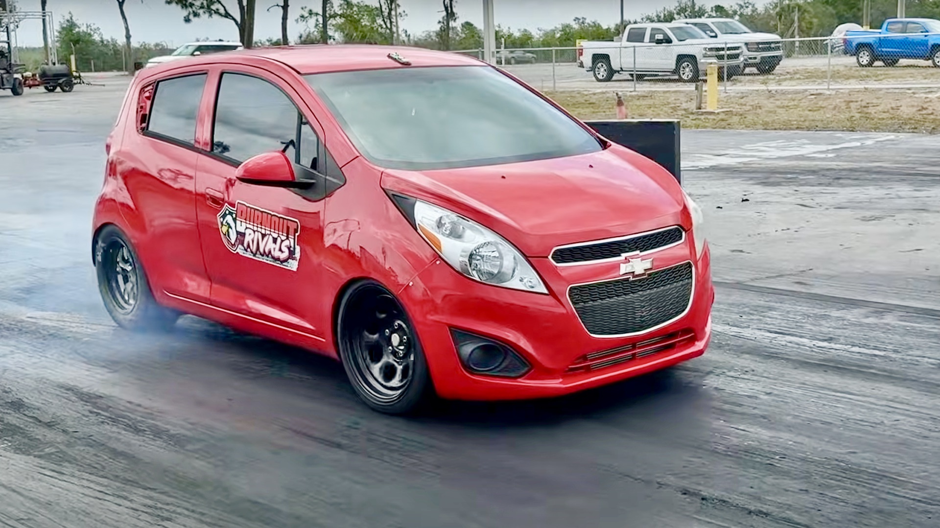 It’s safe to say this tiny econobox nicknamed Crouton is the quickest Chevrolet Spark in the world. YouTuber Cleetus McFarland and his team have been preparing for the Burnout Rivals competition, and this wicked red hatchback was the basis for it. However, things took a turn when they decided to throw drag radials on it and attempt to make it the quickest (and fastest) Chevy Spark through the quarter-mile. And it seems they pulled it off, smashing a 9.995-second run.