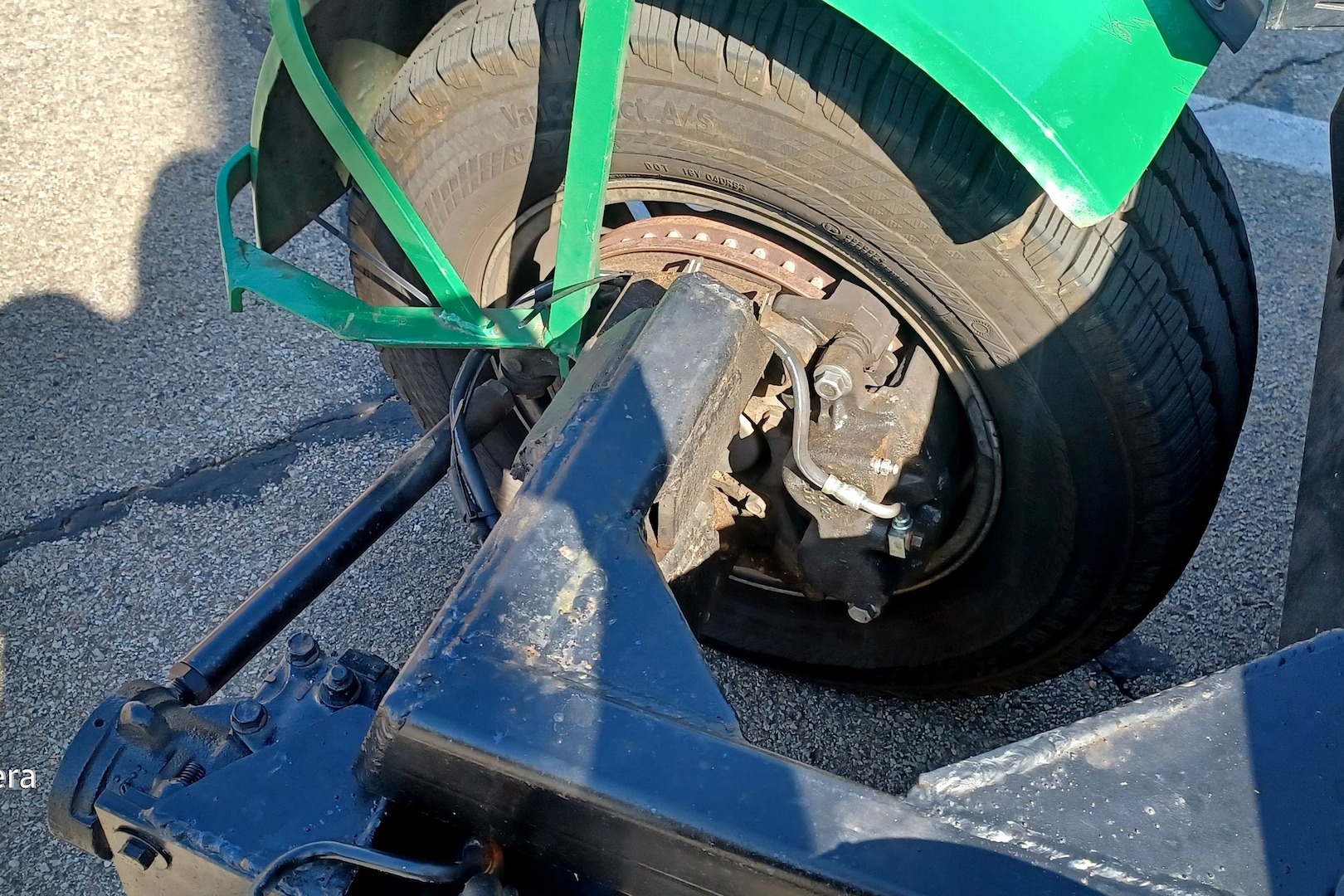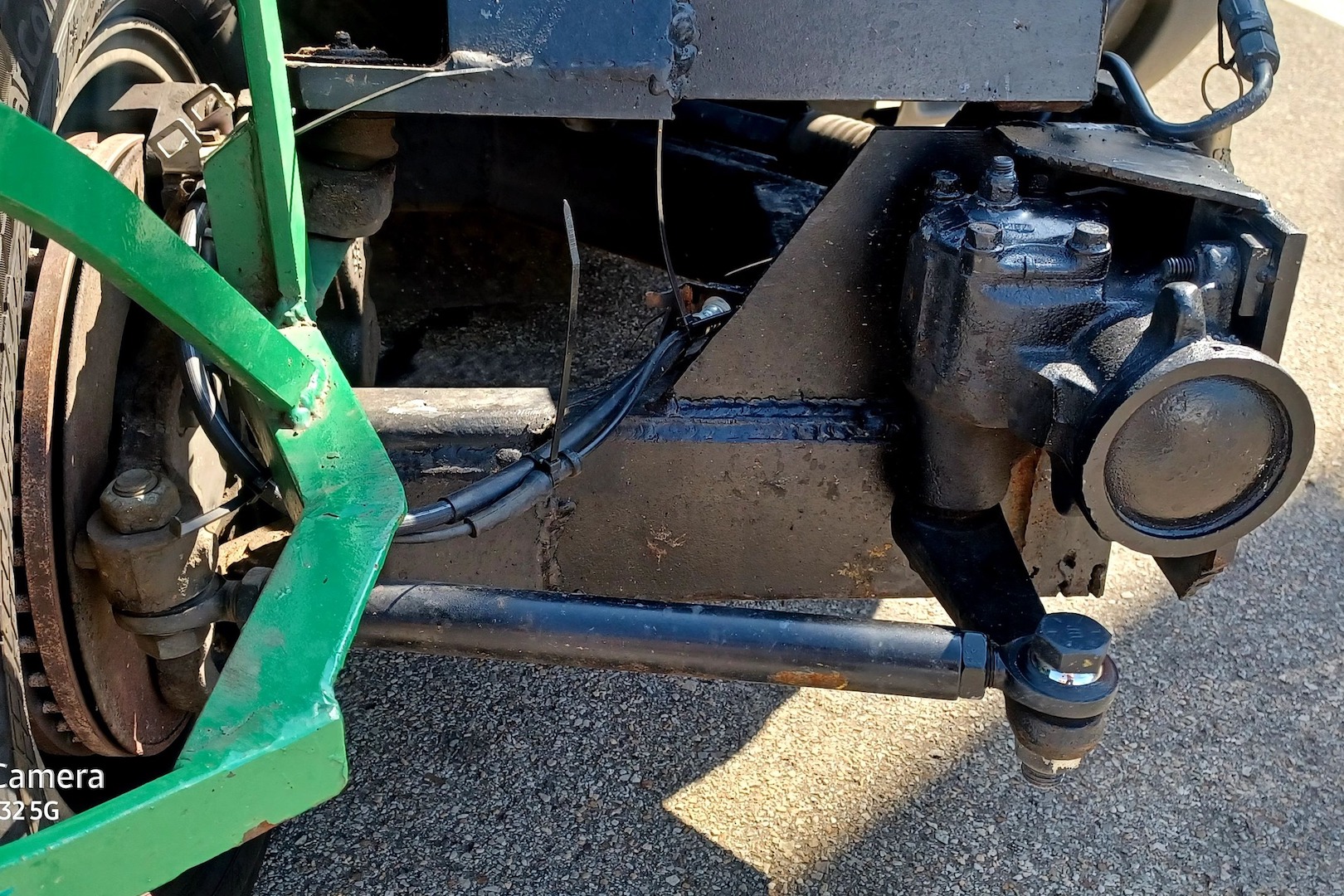 For starters, the wheel is mounted on a single, L-shaped extension on the front of the truck, protruding through where the bumper would be. It’s not clear from the photos if this is a suspension arm or merely an extension of the frame, but in either case, it’s subject to torsional forces that are probably way too hefty. It looks to be assembled from beams that are just multiple metal plates welded together, using welds best described as scabby.