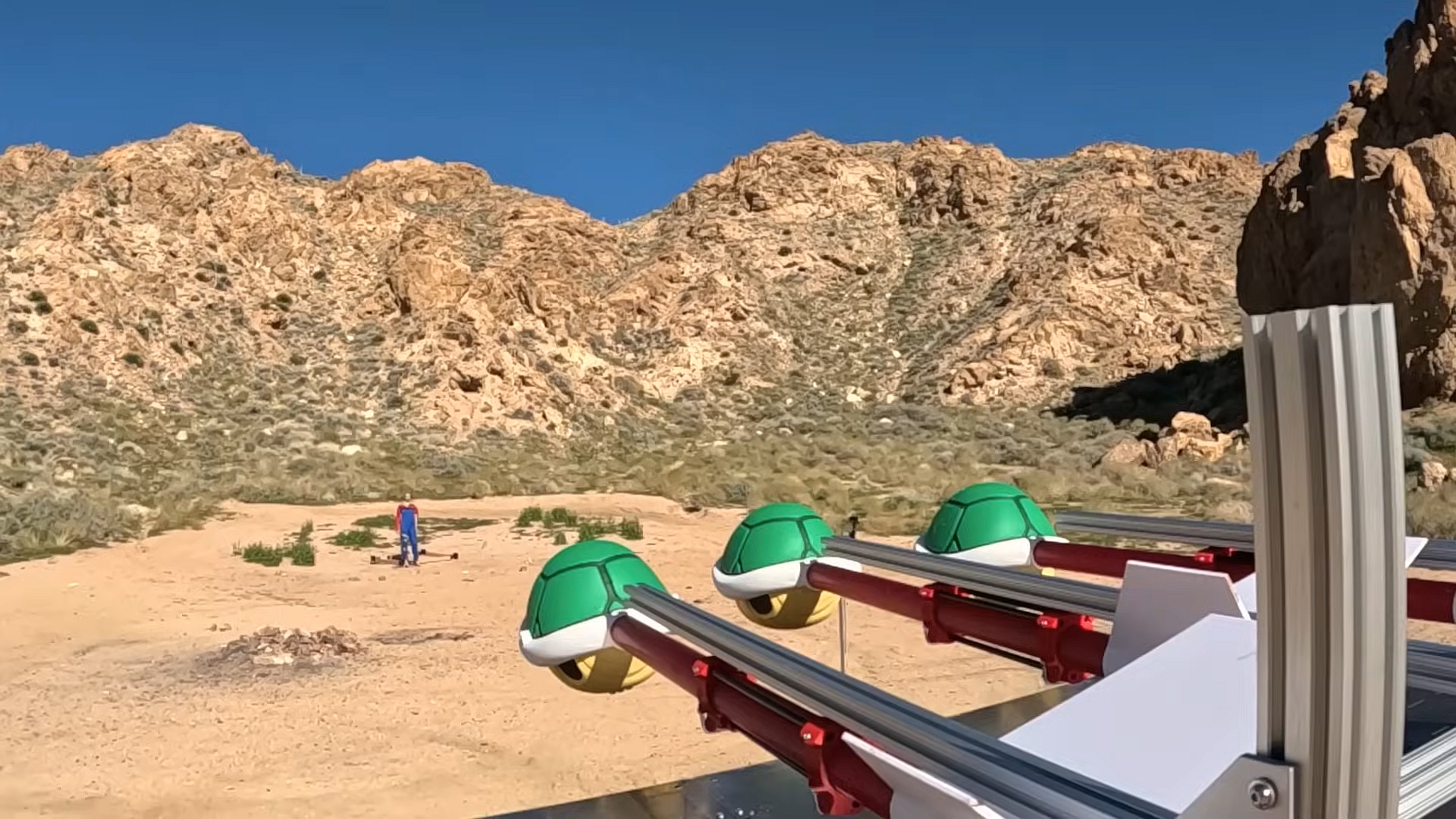 And not just craft the shell. That’s the easy part thanks to 3D printers. The fun, frustrating, and fearlessly stupid part is weaponizing the shell like in the game. For those who’ve never been challenged by your neighbors (and their kids) to a Mario Kart session, in the game, a shell will not only send your opponent’s vehicle spinning but also dislodge your opponent from said vehicle.
