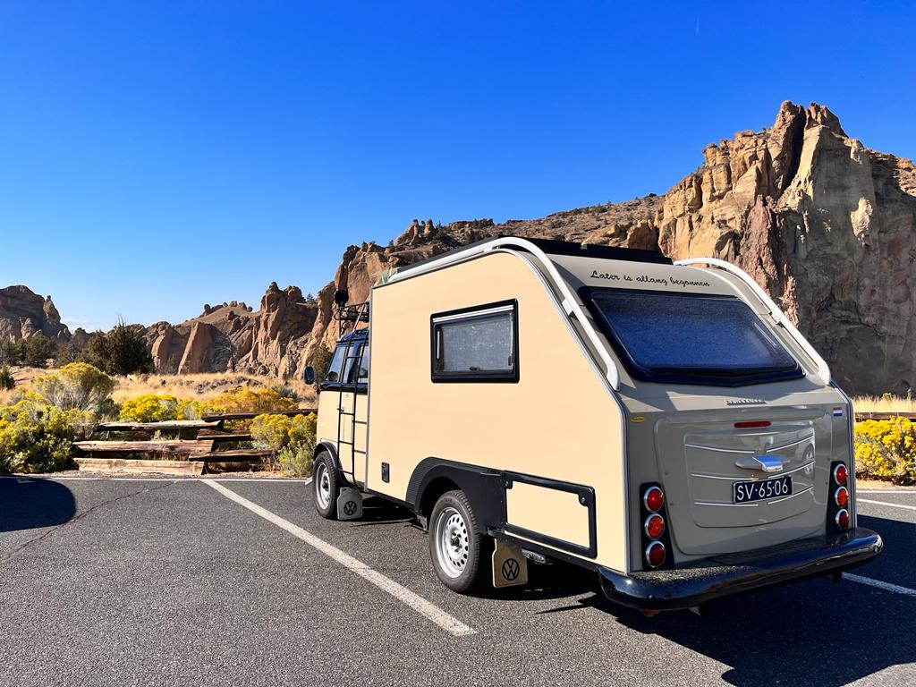 The camper is equipped with everything one could want on the go, and then some. Its Porsche-sourced front seats can rotate to face a living area outfitted with a fridge, LED lighting, Bluetooth speakers, multiple USB chargers, and a heated floor, all powered by dual 12-volt car batteries. Every last one of its windows opens, and they’re double-glazed for better insulation, while roller screens and blackout curtains offer privacy. On the outside is a kitchen beneath a canopy, along with gas and power hookups. No word on a privy, but that roof rack can surely fit a shovel and some toilet paper.