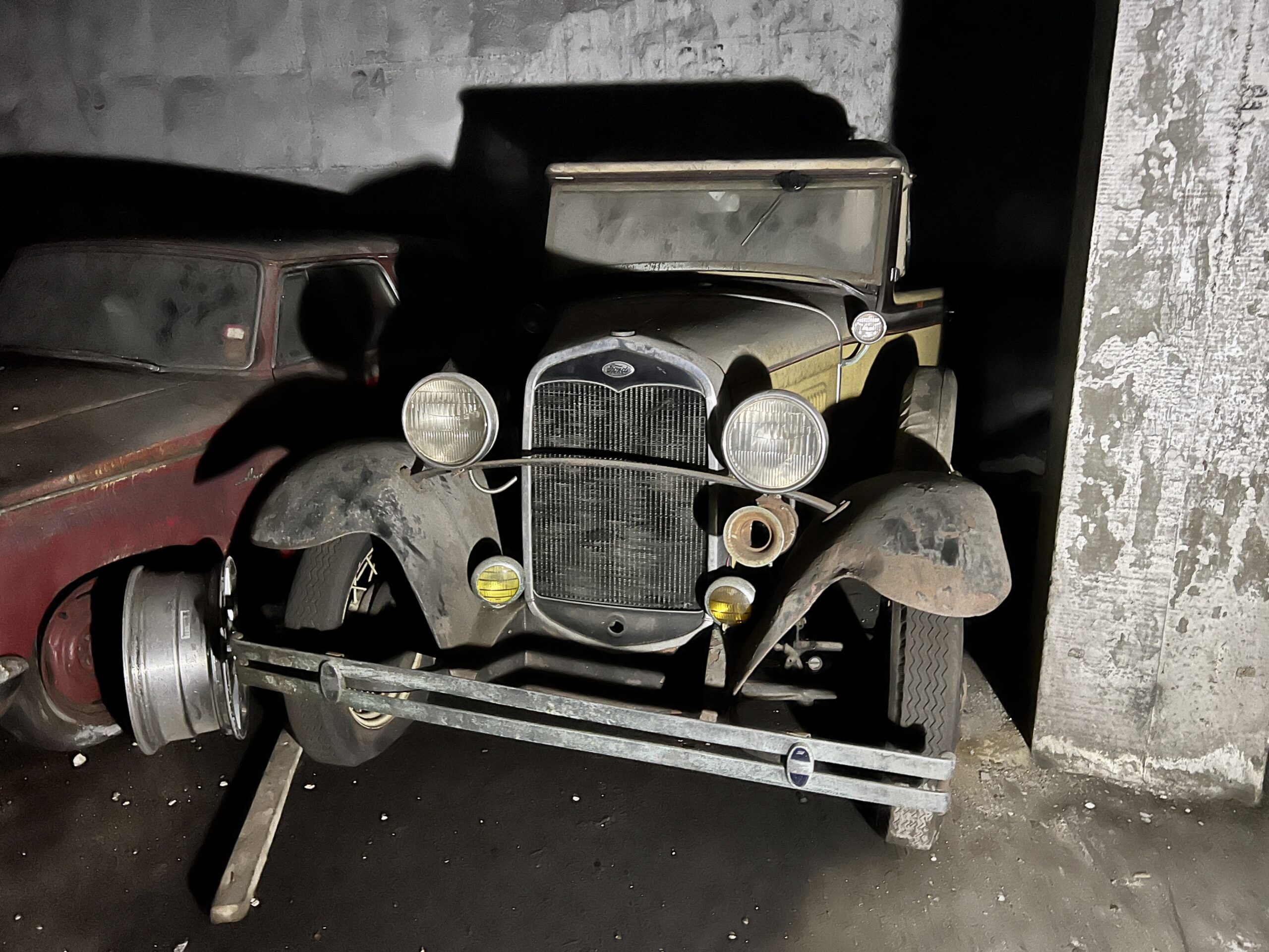 Some cars in the basement are beyond repair—a blue W114 Mercedes is completely rotten, with a light blue VW Bug and a green BMW 2002 not far behind it. Just looking at the Rambler’s hood made me grateful for my tetanus shot. Others are surprisingly clean—a yellow-and-black Ford Model A roadster, a sixties Plymouth Barracuda, and the Jag look promising. The cars on the ground and second floors have fared better as they’ve been spared the worst of the water intrusion. Many are on jacks, either to avoid the water or to free wheels in preparation for their exodus.