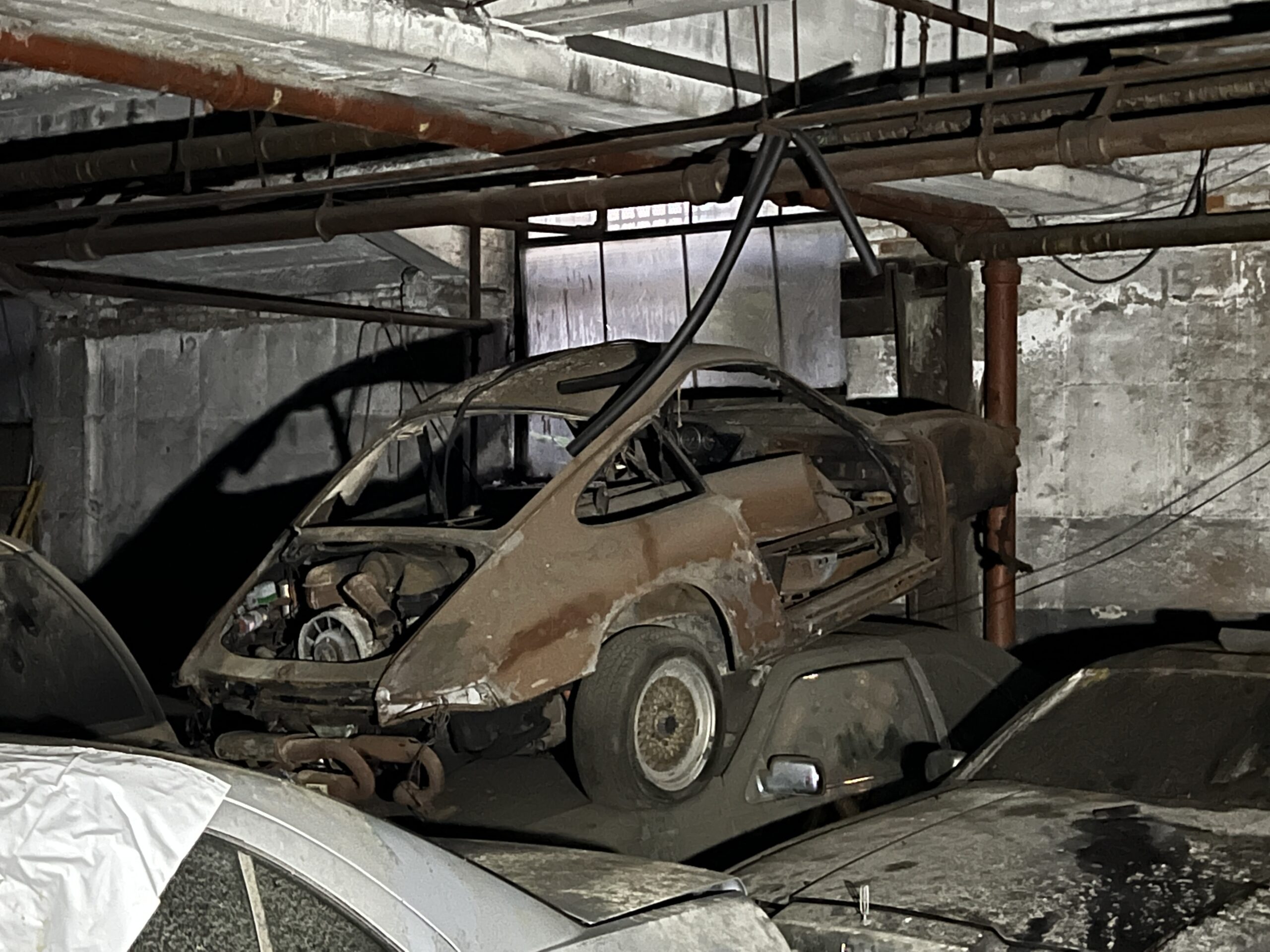 Finally, it was time to visit the basement. “You might not like what you see down here,” Chris warned as we descended the ramp into darkness, flashlight in hand. “It wasn’t always this bad.” The smell of standing water hit me immediately. Chris explained that the demo crews had removed part of the roof and had been drilling holes in the floor, but water had been coming in for far longer than that. This seems to have been the European wing, with two BMW 2002s, an E21, and two Triumph TR6s lining part of a wall next to a Fox-body Mustang. More VWs, including a Type 3 Fastback, filled a nearby corner. Opposite them, a Porsche 924 Turbo and what was left of another early 911 sat among a navy fleet of Lincoln Continentals, with the 911 perched precariously atop one of the land yachts. An early Corvair and C3 Corvette represented GM, and a Jaguar Mark X with a lovely red leather interior and manual transmission was the resting spot for a couch.