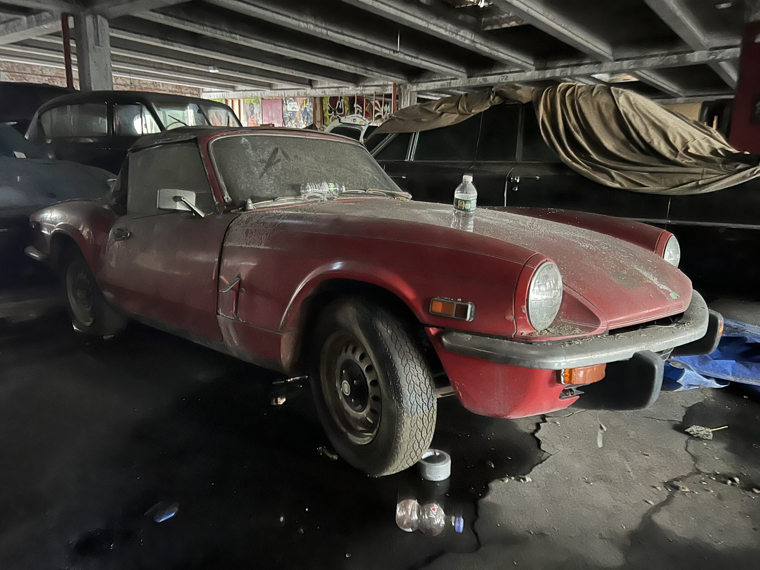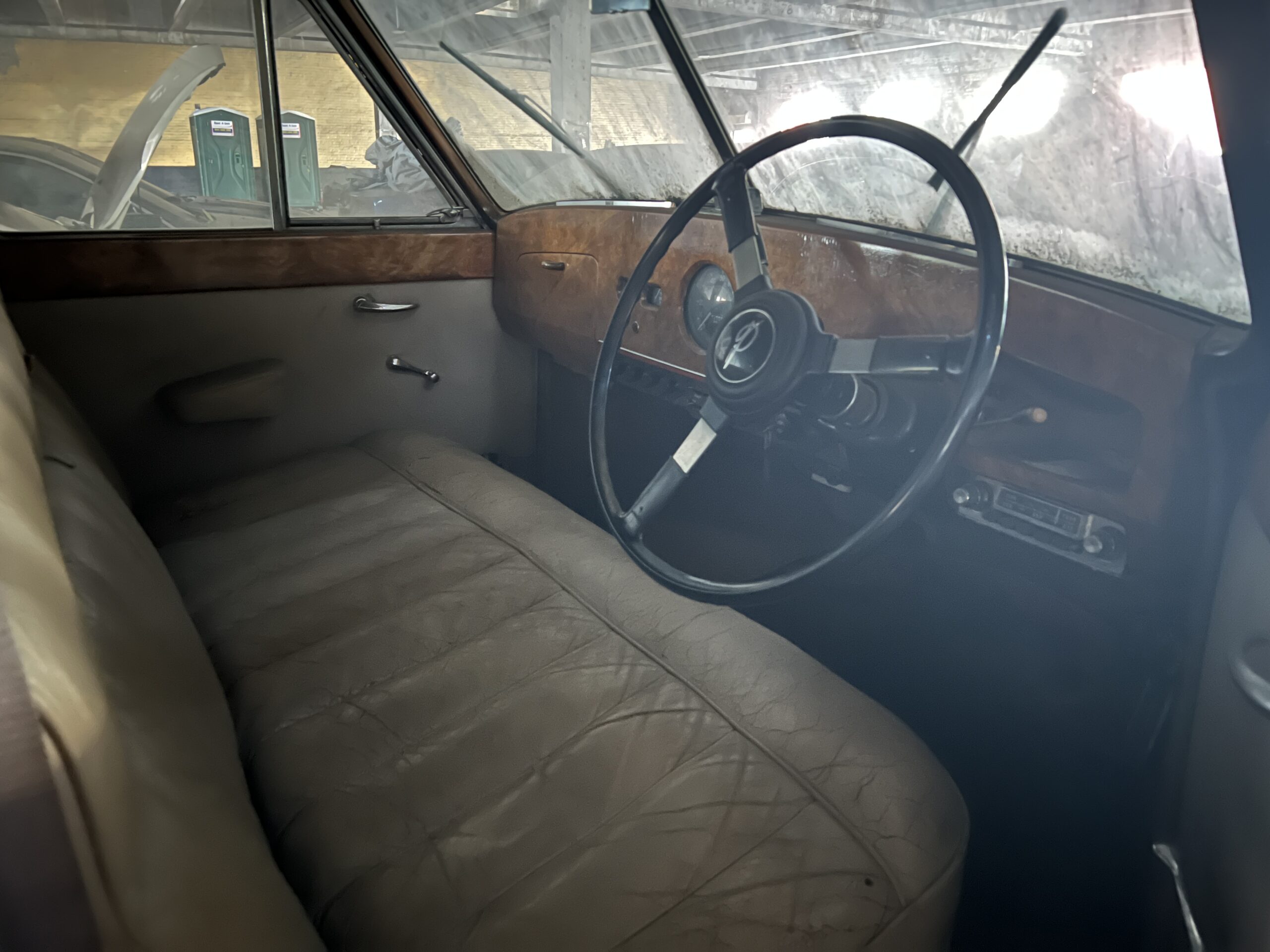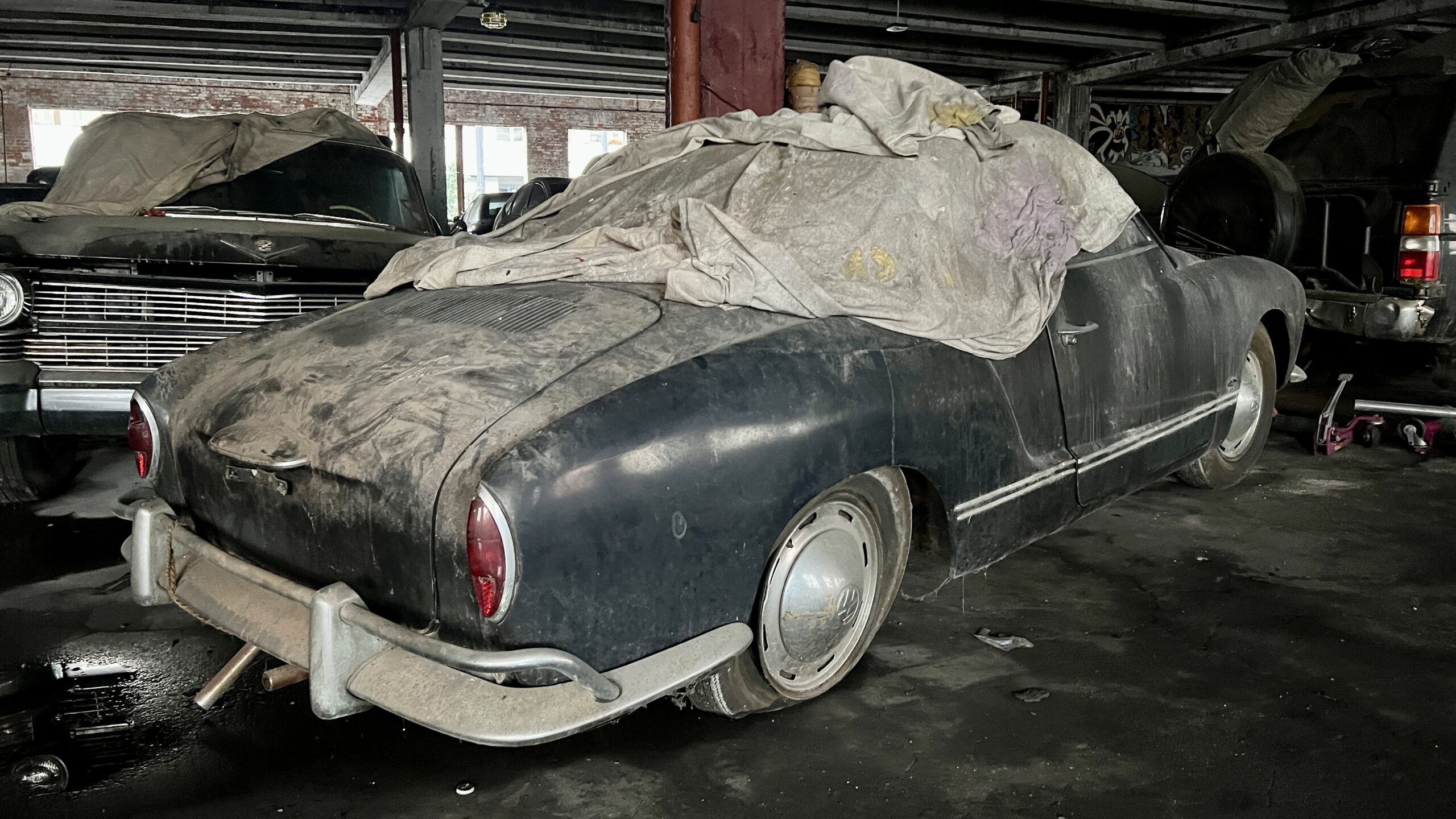 “You’re not going to get murdered, I promise,” Chris said as we ascended the main ramp to the garage’s second story. It was nearing dusk, and light filtered in through holes where windows were recently removed in prep for demolition. As we reached the landing and round the corner, I spotted a Volkswagen Karmann Ghia half-covered by a tarp—behind it, a red Triumph Spitfire and a ‘64 Cadillac. But we’re just getting started. Behind the Cadillac sat an Austin Princess limousine, a tan-on-tan ‘49 Chevy convertible, and a Plymouth of similar vintage. A coffee-colored late-’70s Ford pickup and a Datsun 280ZX rounded out the treasures on this floor, though there were at least a dozen more pedestrian vehicles scattered around. It’s overwhelming, and I took refuge in the office before continuing the tour.